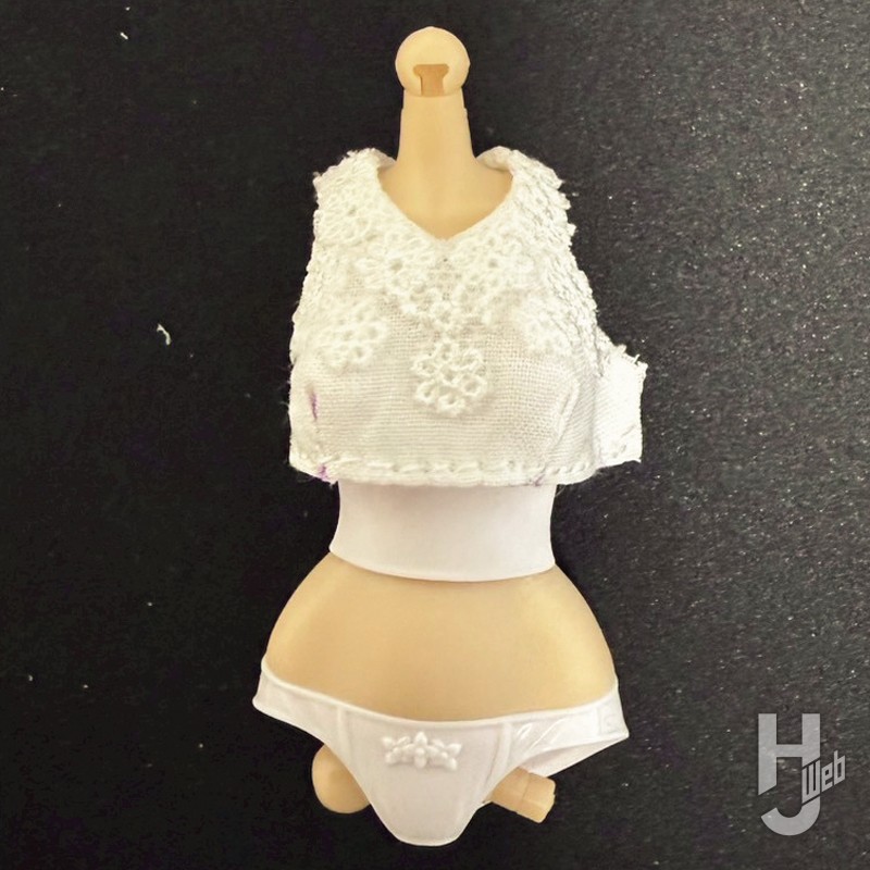 「ルミティア ReACT-iF」の下半身パーツと「リラックスウェア」タイプの上半身を組み合わせます。布服着用には「インナーウェア」のように何も着用していない素体を使う場合が多いですが、下着を付けず服を着ることはあまりないのでは? と思い「肩紐がクリアーのキャミ下着」を着用しているイメージとしています。花柄レースのTシャツ風の白い衣装なので透け感もあり、素材の色やデザインの要素をより感じられるかな、とも思います。