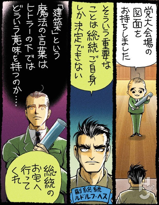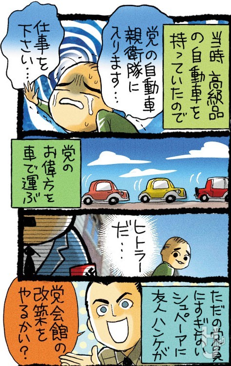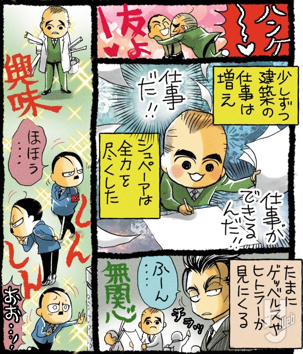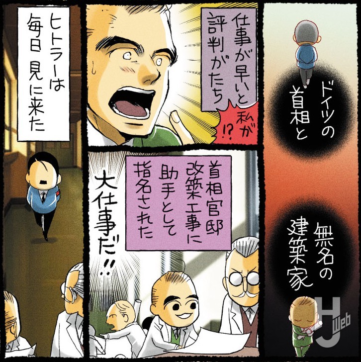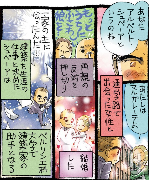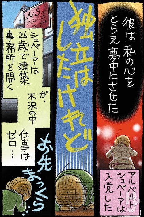 1905年ドイツ、マンハイムに生まれる。政治的なことには無縁の家庭で裕福な子供時代を過ごし建築家となった。ヒトラーの演説に感銘を受け国家社会主義ドイツ労働者党(ナチ党)に入ると党から建築の仕事を受けるようになりヒトラーに見いだされる。