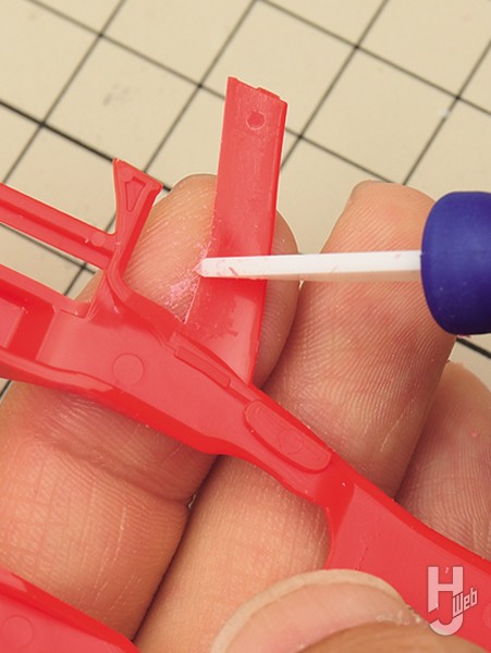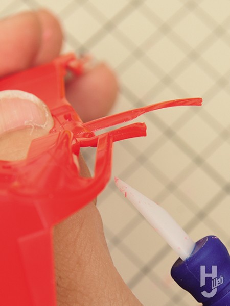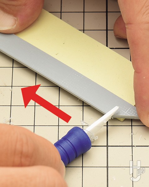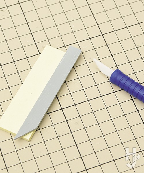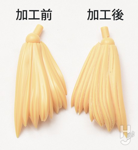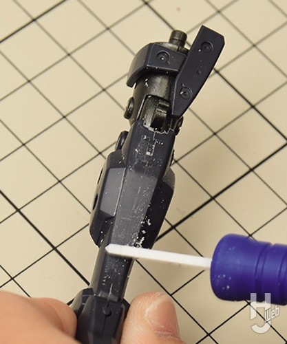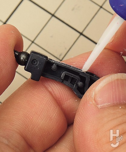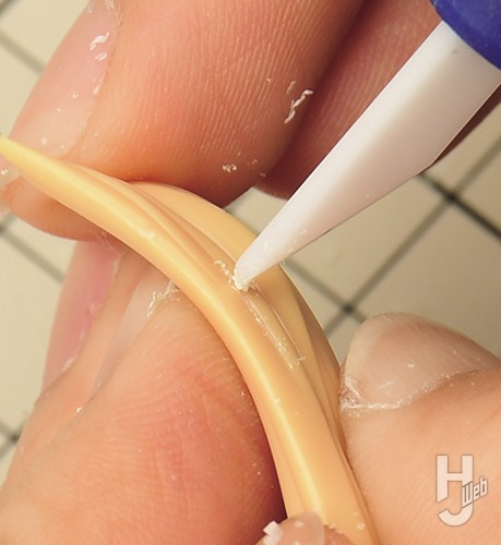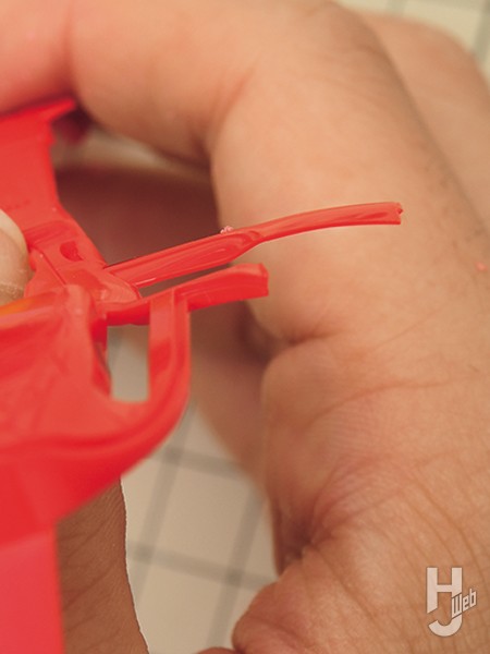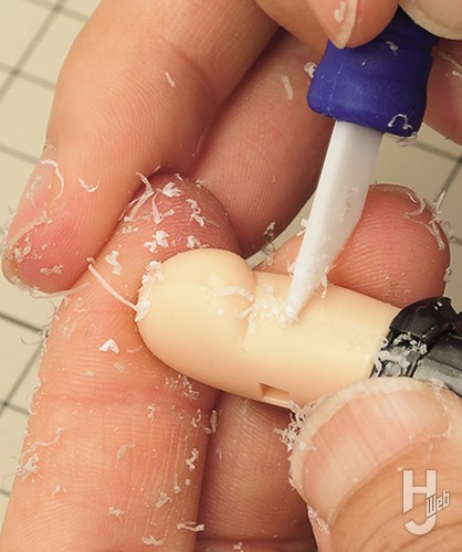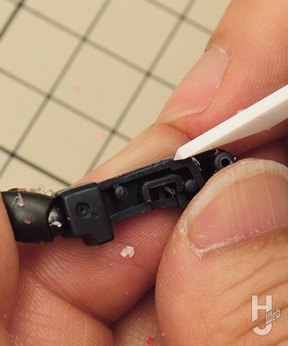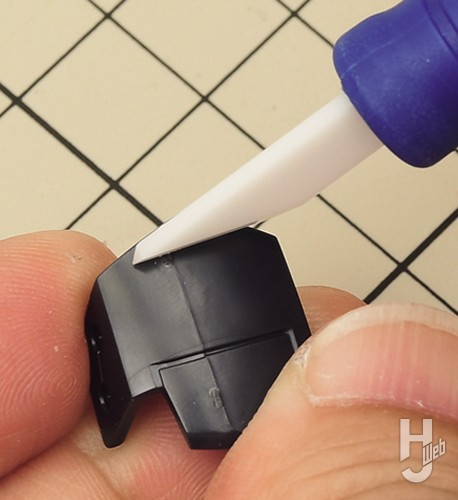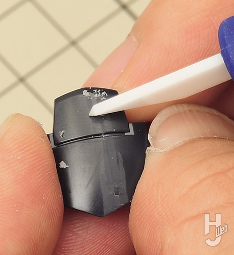 ▲ゲートをちょっとだけ切り残してしまったら、さっそくマジ・スクの出番です。ブレードを合わせてちょっと力をかければ、ゲートの端から刃がすーっと入り削ぎ落とせます。ニッパーでは苦手な曲面部分や内側のゲートもマジ・スクにおまかせです