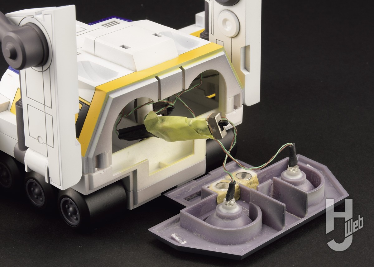 5号のエンジンノズルには、市販LEDユニットを仕込みました。仕込み方は簡単で、ノズル中心に穴を開けてLEDを差し込むだけ。電池ボックスはそのまま内部に放り込みます。これだけでも5連合体作戦時の満足度が上がります。
