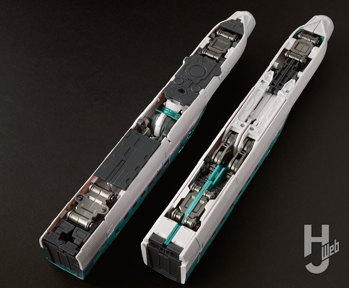 ここでは、シンカンセンモードからシンカリオンモードへの変形プロセスを紹介していこう。商品にはアニメ映像の変形シークエンスのように、先頭車のノズル部が開いて連結することで後部車両のロックが外れて、左右にカバーが外れるギミックを搭載。ここから変形がスタートする。