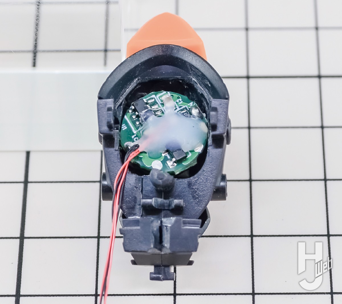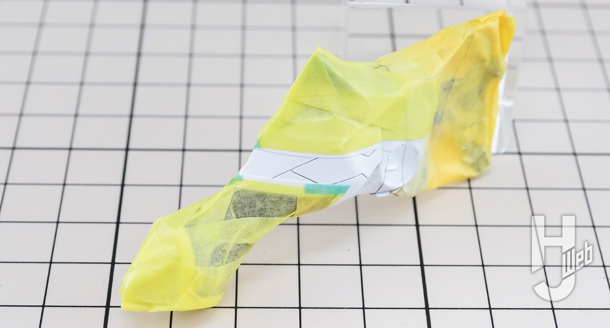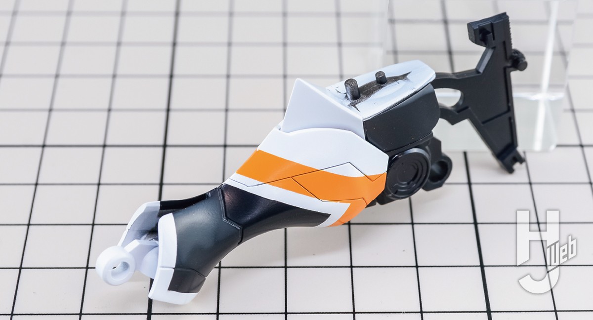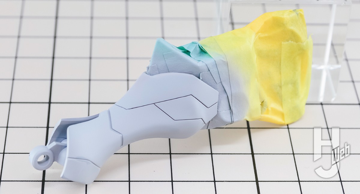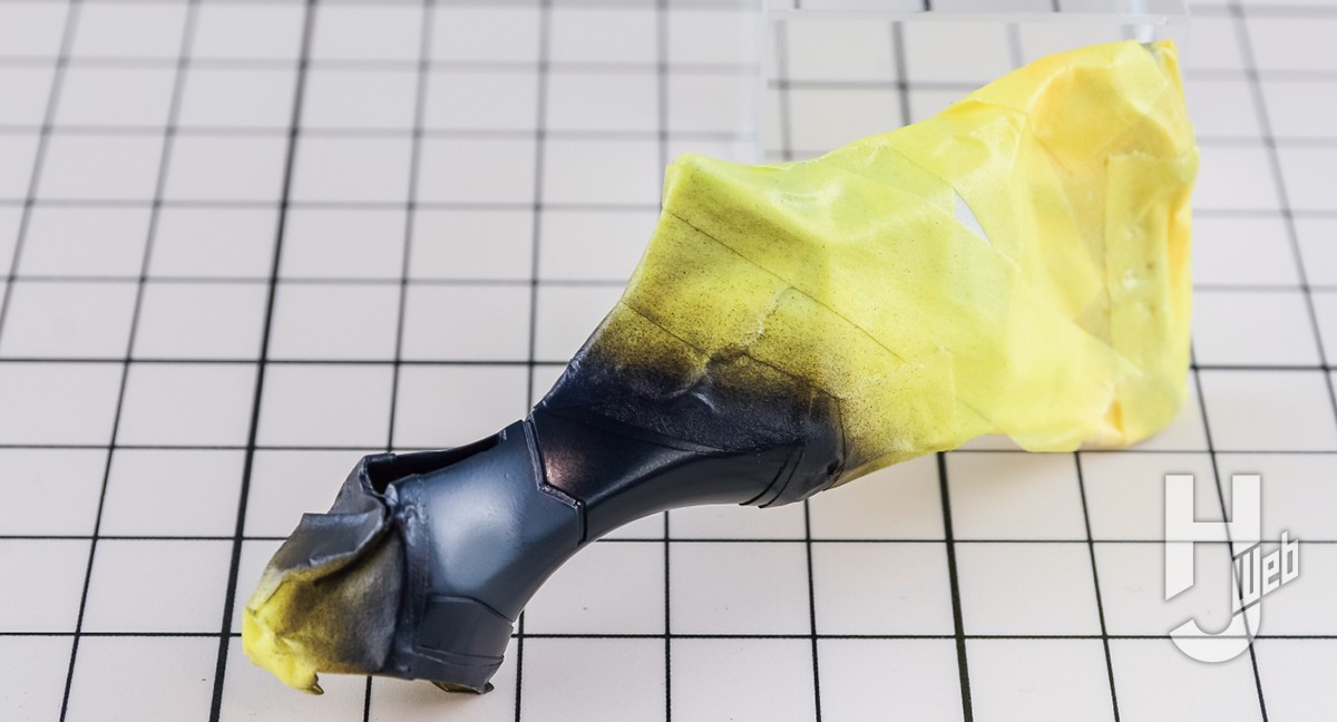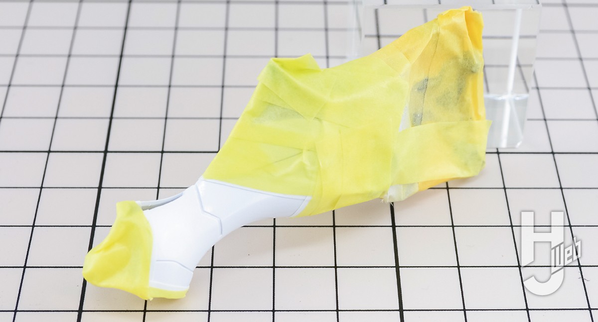 太モモやスネははさみ込みになっています、先に太モモの整形を済ませてから塗装、マスキングしてスネの整形→塗装と、少し手間ではありますが、じっくり時間をかけて作業すれば難しいことはないと思います。ホワイト→ブラック→オレンジの順で塗装すると発色よく塗り分けのラインを出すことができます。