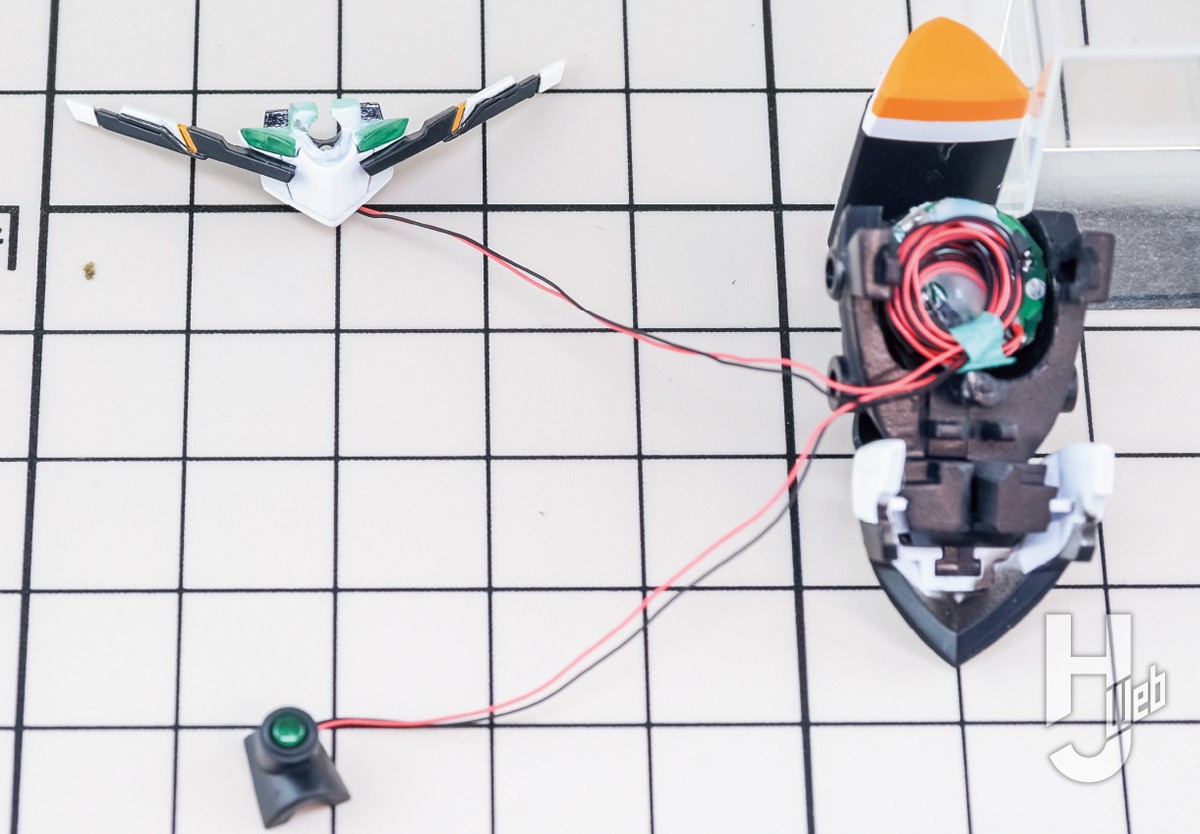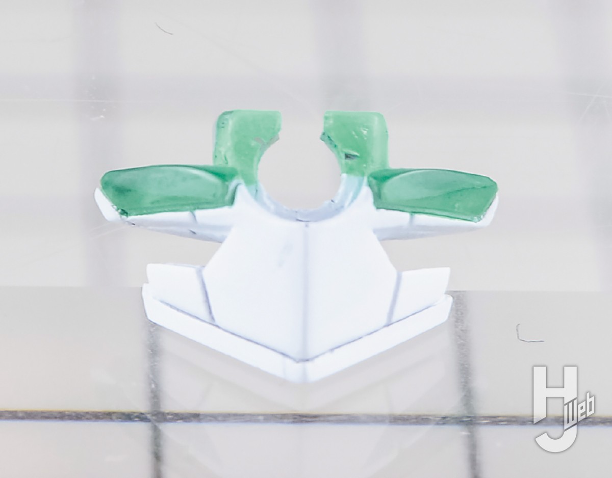 各部にある細いグリーンのラインは、水性ホビーカラーのペールグリーンとみず色を1:1で混色したもので筆塗りし、乾燥後にはみ出た部分を台所用洗剤で抜き取っています。