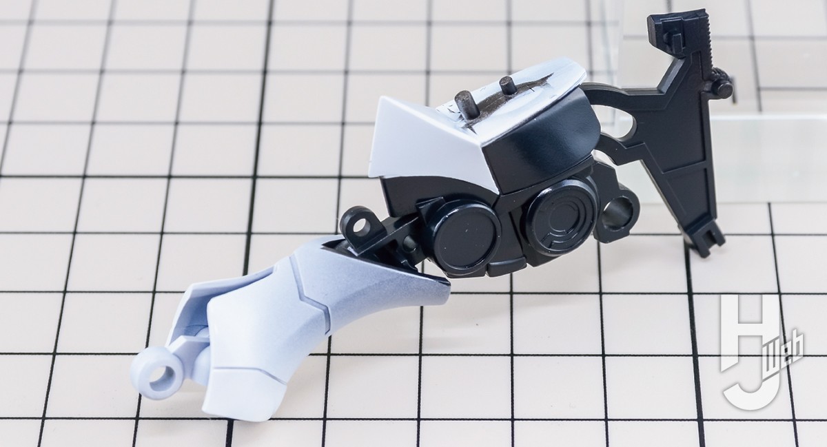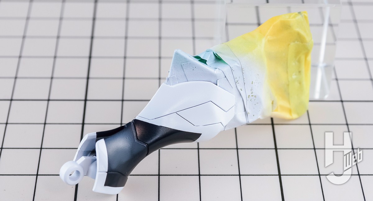 みなさんがこのキットを製作するにあたり、もっとも気がかりなのはカラーリングとその塗装だと思います。今回は頭部、肩、太モモの白いライン部はキットのデカールを使用し、その他はマスキングによる塗り分けで仕上げました。