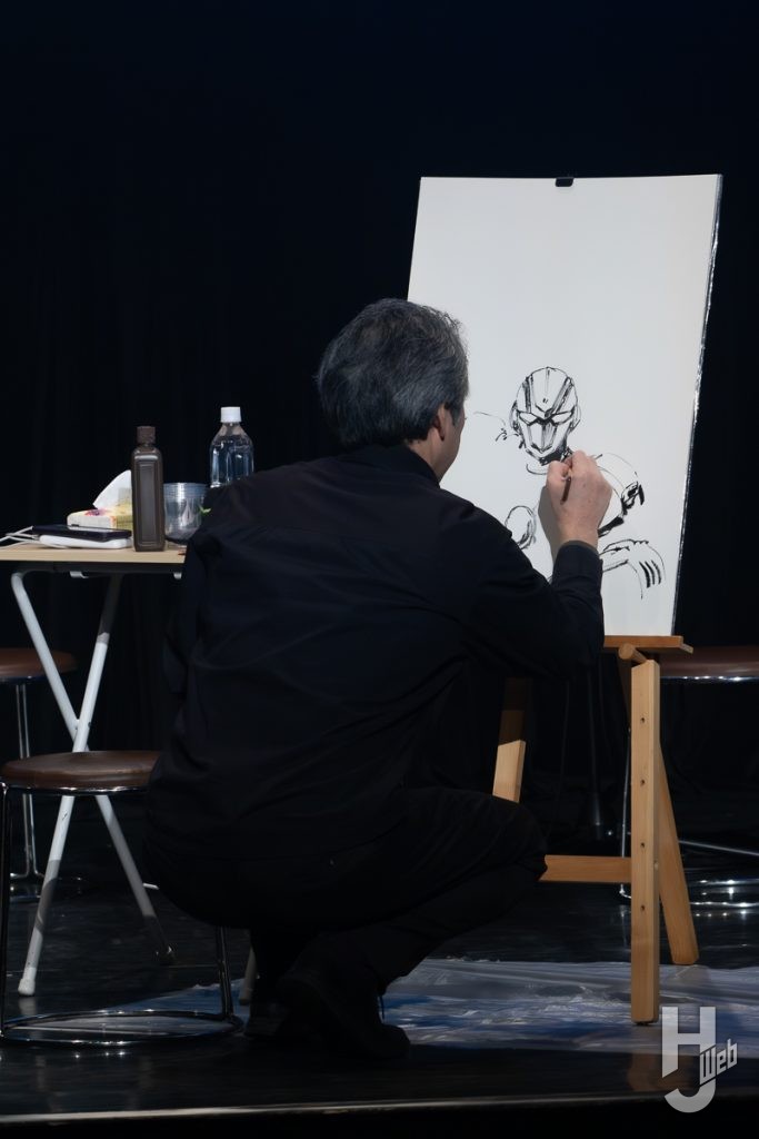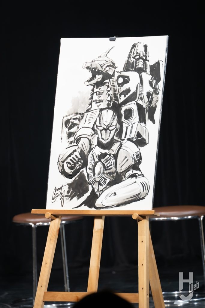 ▲ 開演前に行われていた西川伸司によるライブドローイング。第一部ではコアブレイバー・ライゼロス・ガントラスの「コアメカ」3体が描かれた