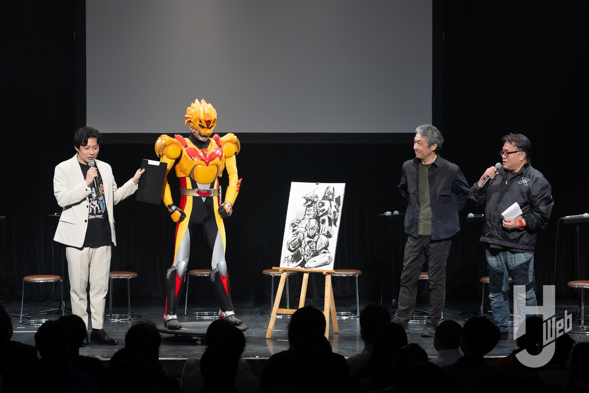 続くレジェンドクリエイタートークのコーナーでは、シリーズ総合プロデューサーの船田晃、『グランセイザー』監督の鈴木健二、造形の品田冬樹、デザイナーの岡本英郎が登壇し、資料やメイキング写真をスクリーンに映しながら製作の裏話が語られた。