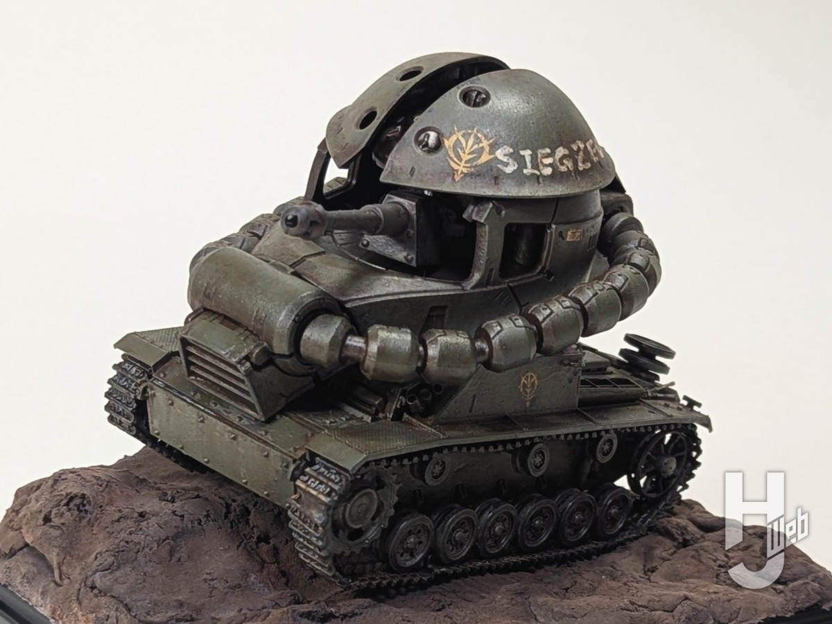 頭頂部外装をアッガイのものに替えることでバルカン砲を機銃として使用している点や、より傾斜装甲に見えるフォルムなど、ミリタリーモデルとしての完成度の高さも見どころ。「ザク」にちなんだネーミングにもセンスを感じます。