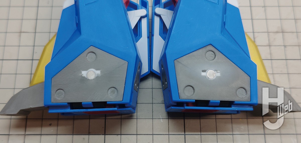 ブレイバーン本体、バーンドラゴンに関しても同様に合わせ目消し、肉抜き埋め、スジ彫りを行い情報量を増やしています。ブレイバーンの肩にあるノズルのようなパーツは内部が平らだったためプラ板でフィンを設置、バーンドラゴンのヒザ部分は市販パーツに置き換えています。個人的に一番気になった部分はバーンドラゴンの脚部接続ピン。ここは磁石による接続に置き換えました。