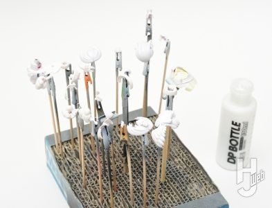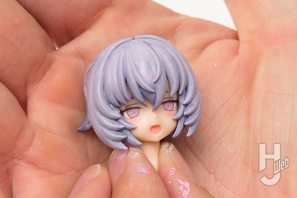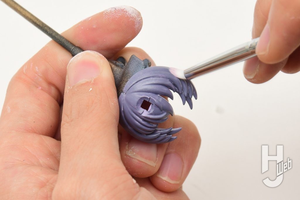 ▲ここから完成に向けて細かな部分作業。髪の毛はスポンジ塗装の上にさらにドライブラシを加えてみます。水性ホビーカラーの「ラベンダー」を使用して髪のハイライトを作ります