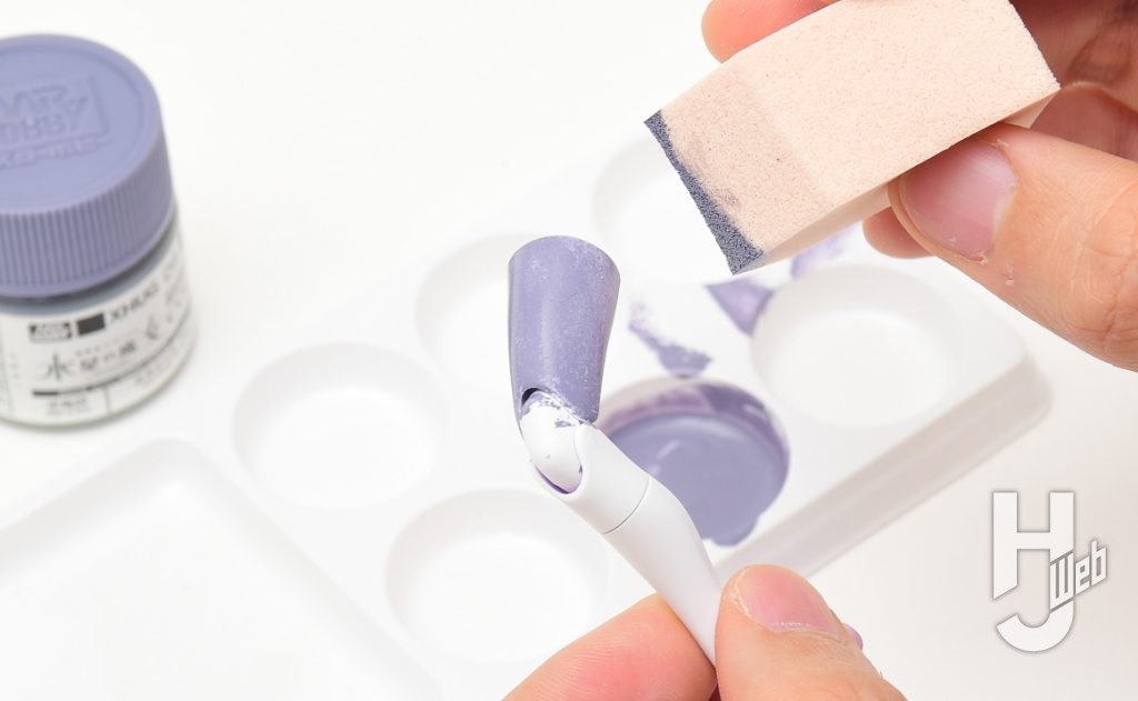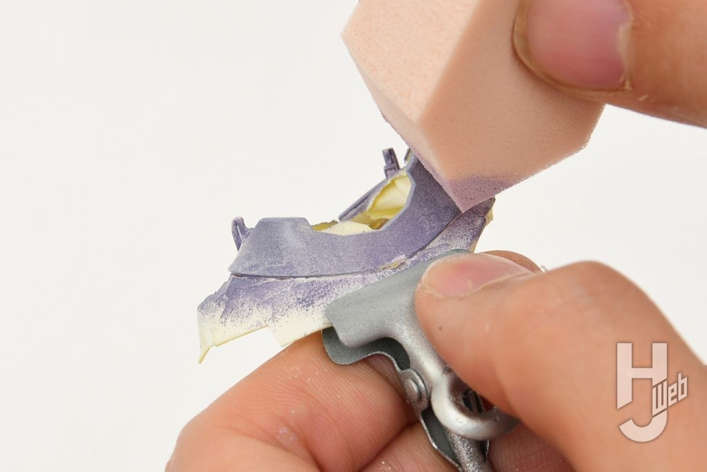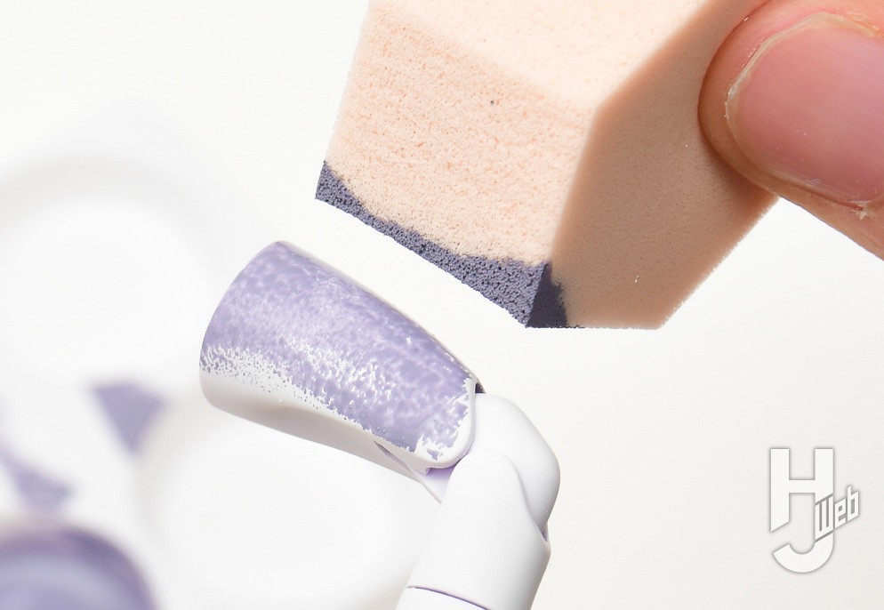 ▲まずは水性ガンダムカラーの「ミカエリス パープル」を使用してベース色を作っていきます。パレットに薄めに溶いた塗料をスポンジに馴染ませたら、パーツにスポンジを軽くトントン叩いていきます。すると少しずつ塗料が映っていくので、全体に薄く塗布していきます