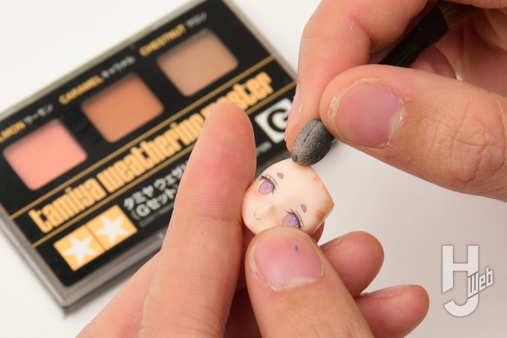 ▲肌のパーツはつや消しのトップコートを吹いてから「タミヤ ウェザリングマスター 」で肌と顔パーツに化粧してみました。こちらも付属のスポンジで色をふんわりと影を乗せていきます