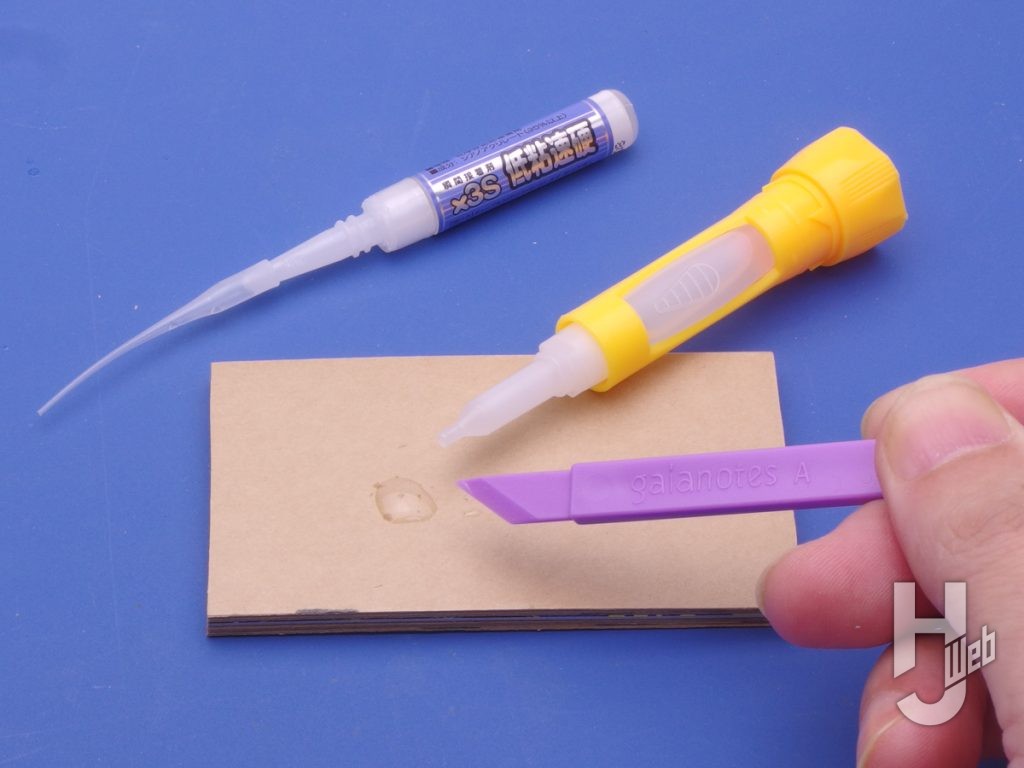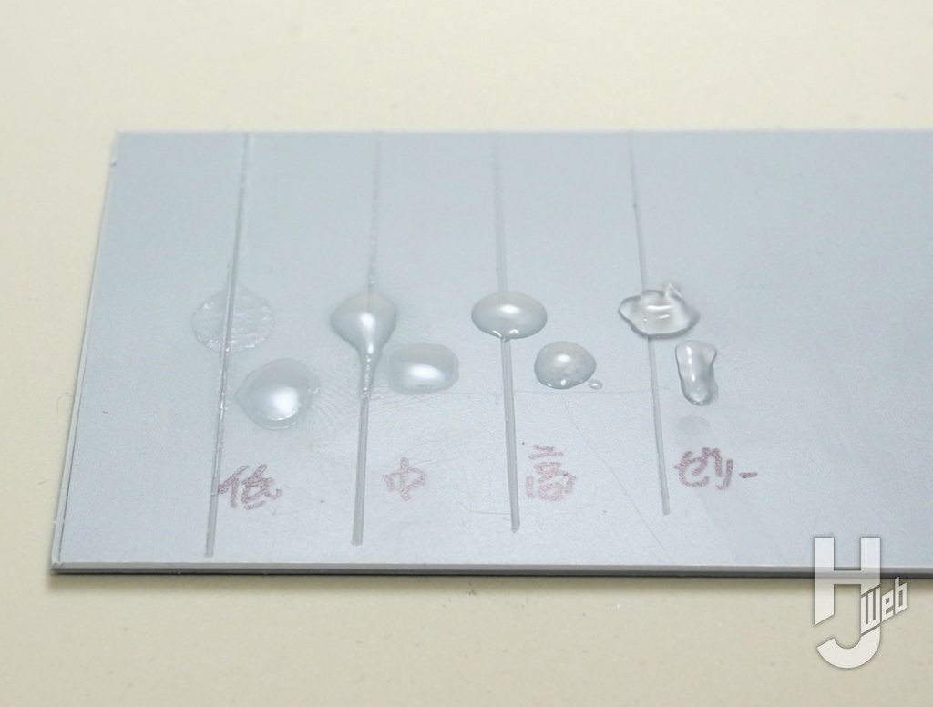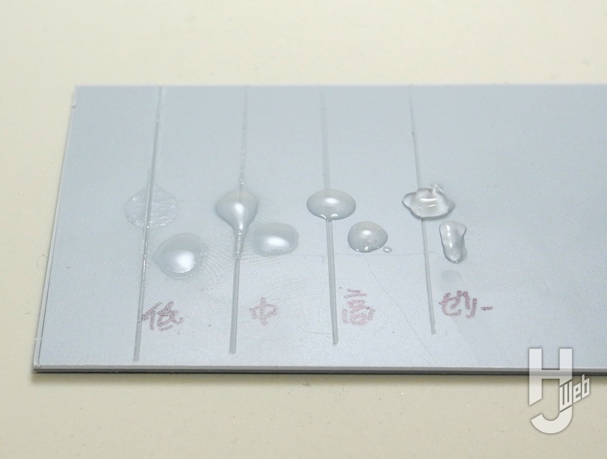 ▲瞬間接着剤で知っておきたい「粘度の違い」を比べてみます。プラ板の面とミゾに「低粘度、中粘度、高粘度、ゼリー状」をつけた例です。粘度が低いとミゾに流れやすく、粘度が高いものは流れず、表面に溜まりやすいことがわかります。瞬間接着剤はこんな特徴で使い分けたりもします