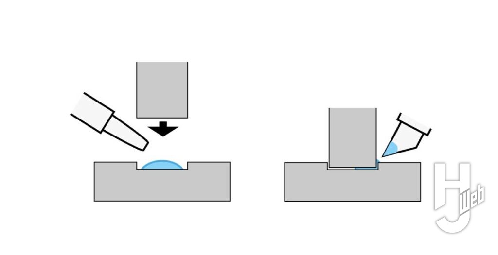 ▲瞬間接着剤は接着面の片方に塗り、貼り合わせて密着すると接着力が発揮されます。位置がズレないように、または位置を合わせてフチから流すように使います