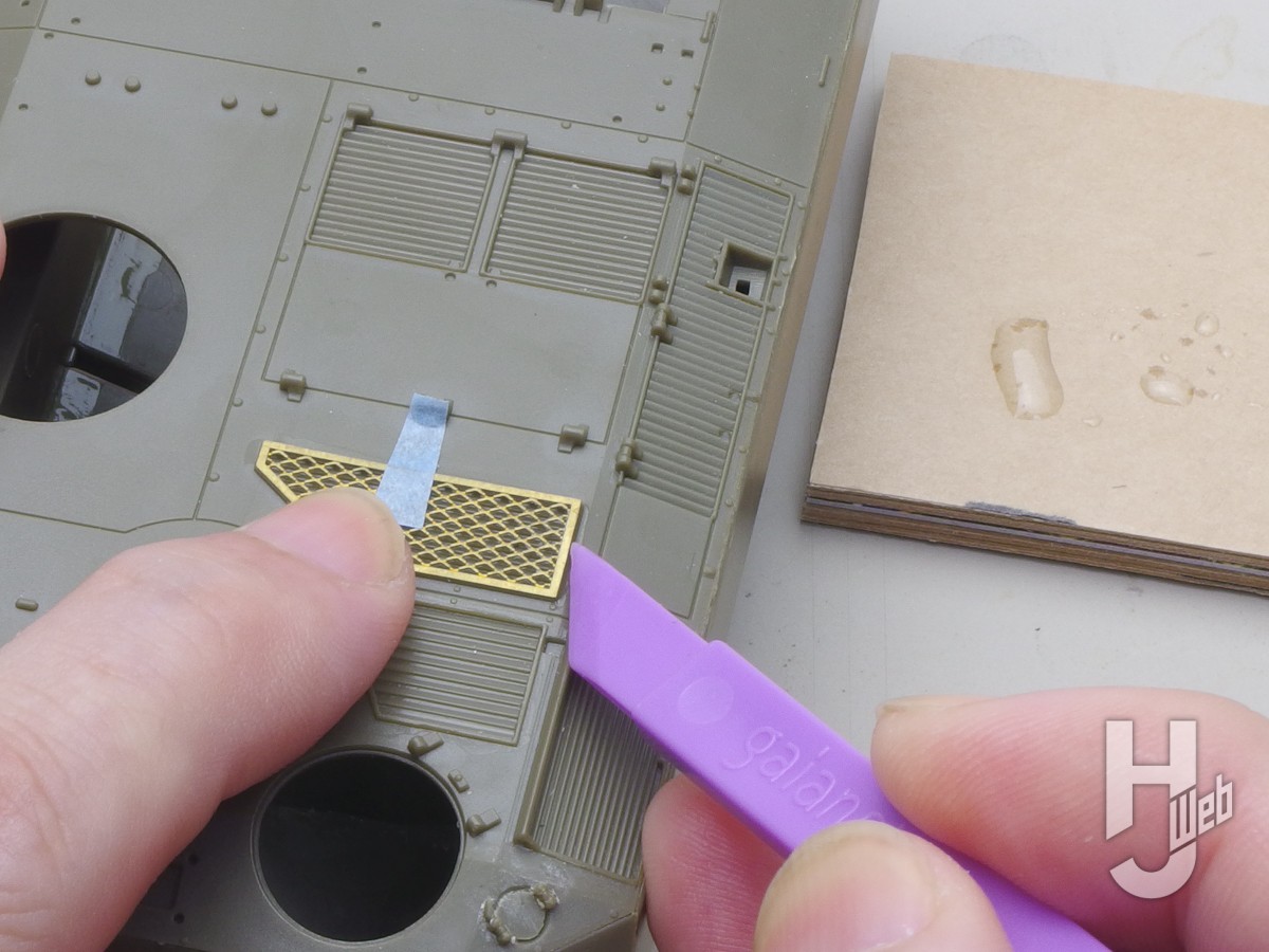 ▲エッチングパーツ(金属の薄板)の貼り付け例。位置を合わせてからパーツのフチから少量流す方法をとっています。周辺のモールドに流れ込まない慎重な方法です