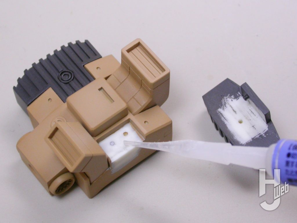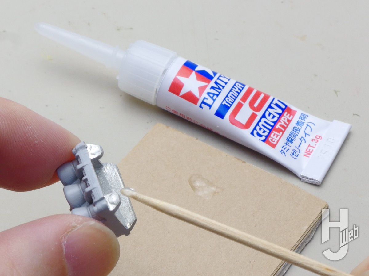 ▲ホワイトメタルパーツの貼り付け例。重さが掛かるところでは高強度やゼリー状タイプが向いています