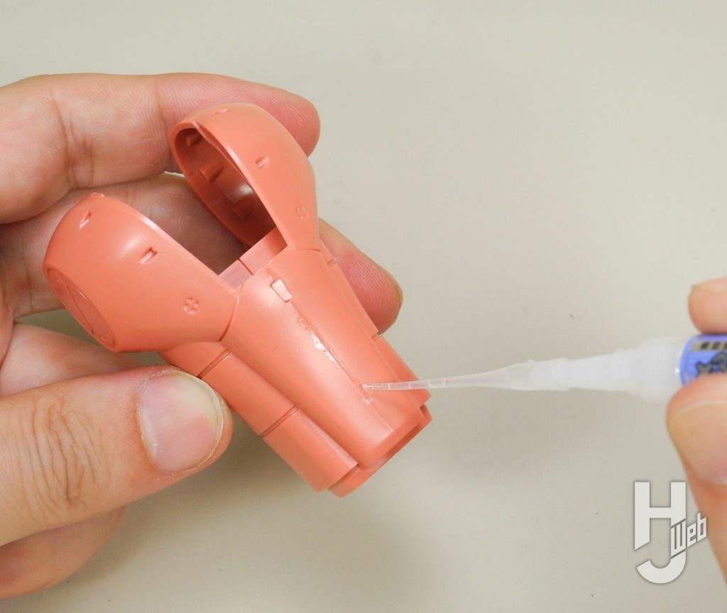 ▲プラ同士の接着で合わせ目消しをするところは、瞬間接着剤で接着と隙間埋めを兼ねる使い方がされます。表面のハミ出しはヤスリ掛けで整えます