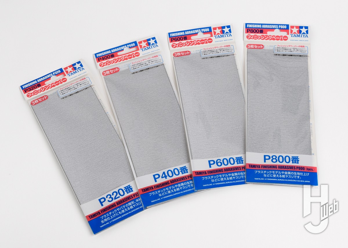 今回使うのはタミヤ フィニッシングペーパー。紙ヤスリは模型作りで避けては通れない、初心者からベテランまでお世話になるツールです。ここではガールズプラモの表面をキレイにするために、320番から800番までを用意。ヤスリの番手とは、1インチ(約2.54cm)四方当たりの砥粒の数を表していて、320番は320個、800番は800個並ぶことになります。同じサイズにたくさん並んでいるので、番手が大きいほど粒が小さく、目が細かいわけですね。