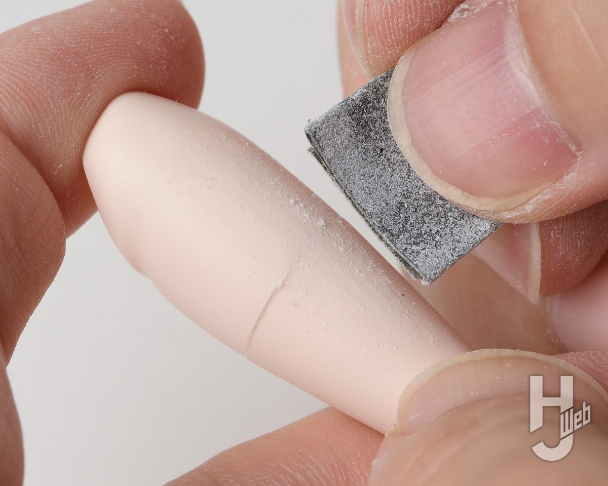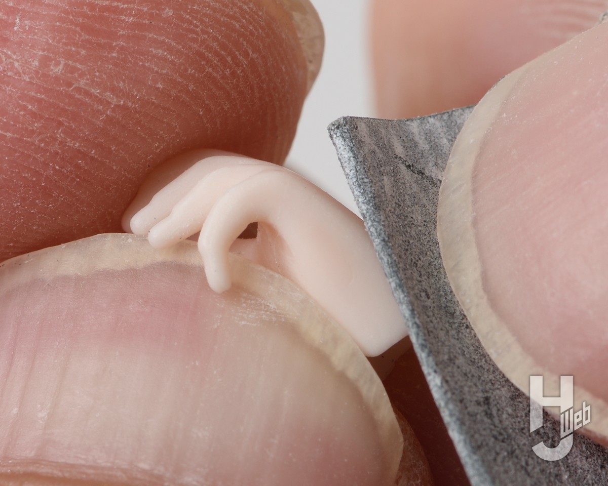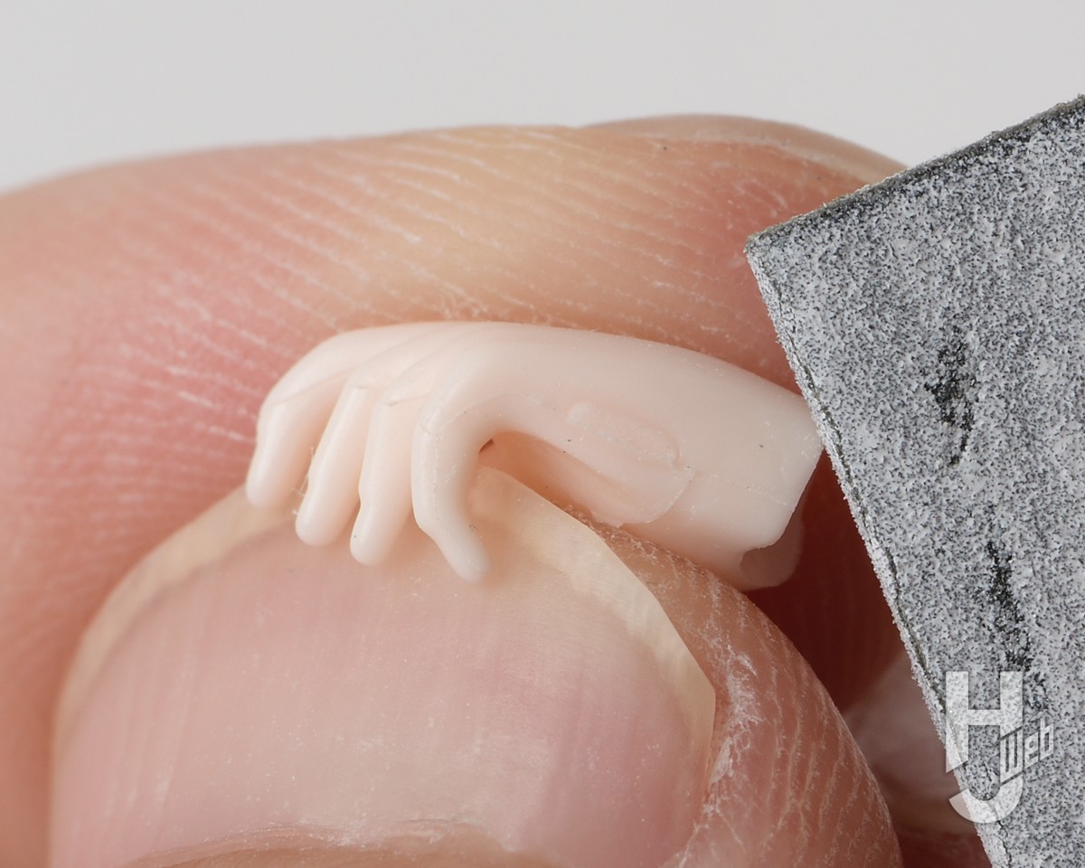 ▲ ハンドパーツのゲート跡処理。こちらはPVC製の軟質素材になっています。こうしたパーツも320番からヤスリがけします