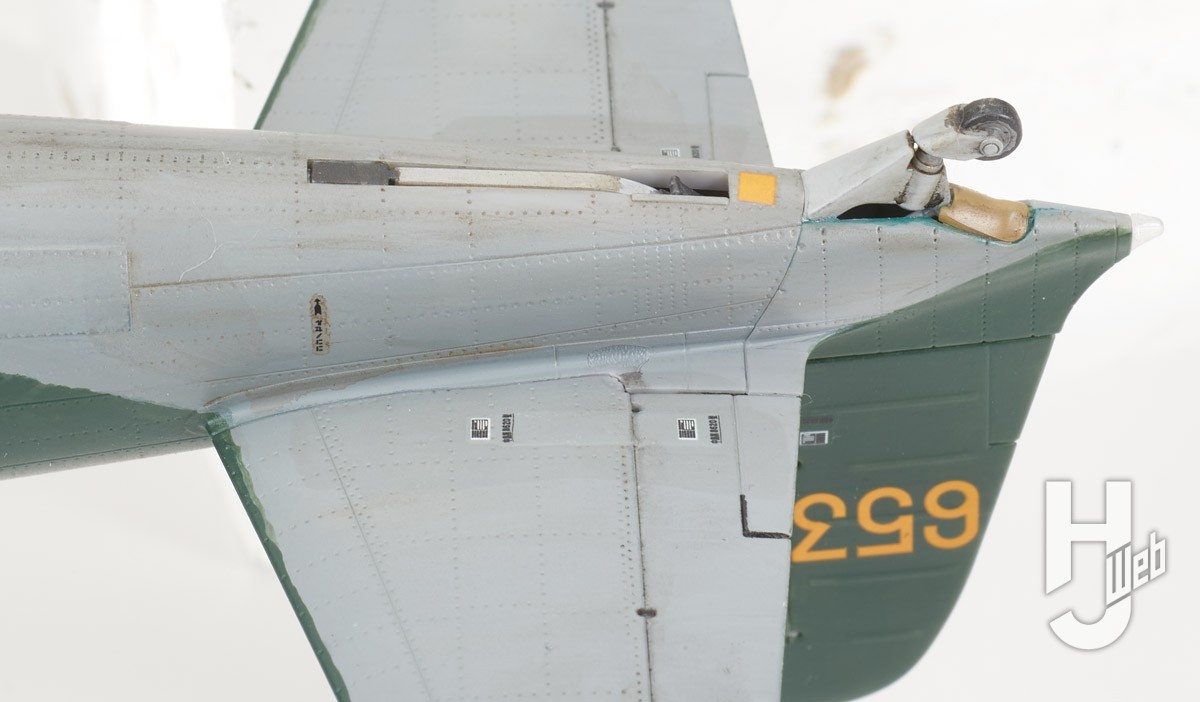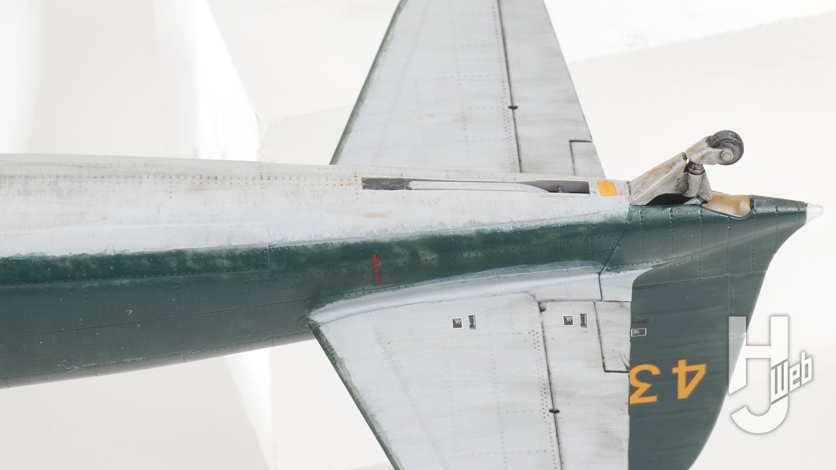 ウェザリングは耐熱鋼鈑が焼けた表現や主翼下面を主にエンジンのオイル汚れなどにとどめ上面は明確なパネルの溝などにスミ入れをし、搭乗時のブーツでの擦れやダメージをラッカー系シルバーグレイで点描しました。乾燥後に、木綿布で上面を乾拭き仕上げします。上面色を下地が見えるほど薄く塗ったので想定どおりの自然に退色した感じが表現できたと思います。
