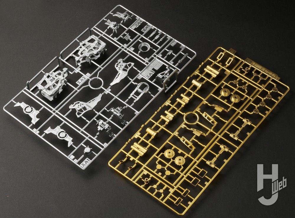 内部フレームの一部や外装から露出するメカモールドはメタリック成型パーツを使用。トラスフレーム等にはシルバー、ダクトやシリンダー等にはゴールドを使用することで、構造材による質感の違いを表現している。