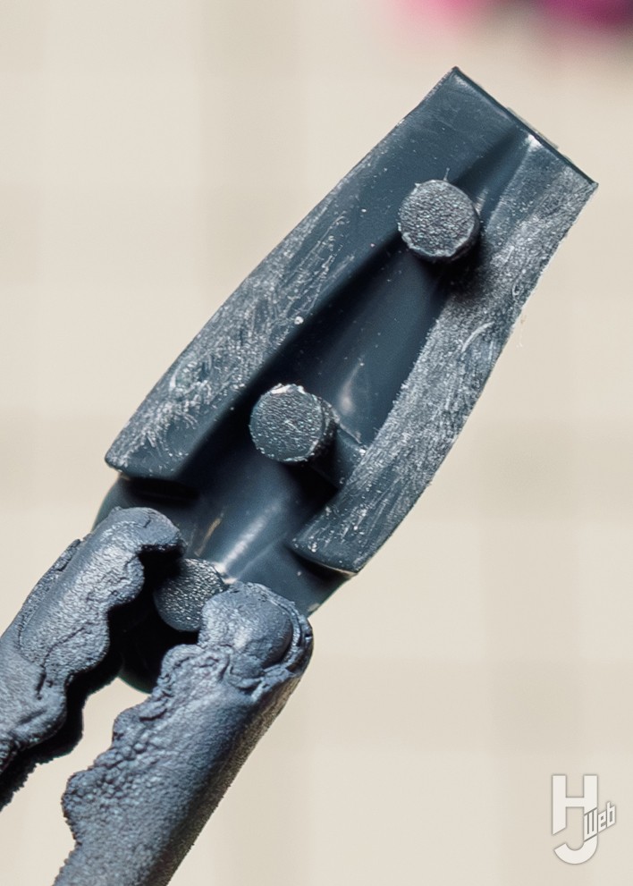 ▲ POM素材が使われている関節は塗装できないため、塗装の際にマスキングして成型色を活かしている。合わせ目をしっかり消すためにアンダーゲートはていねいに整形