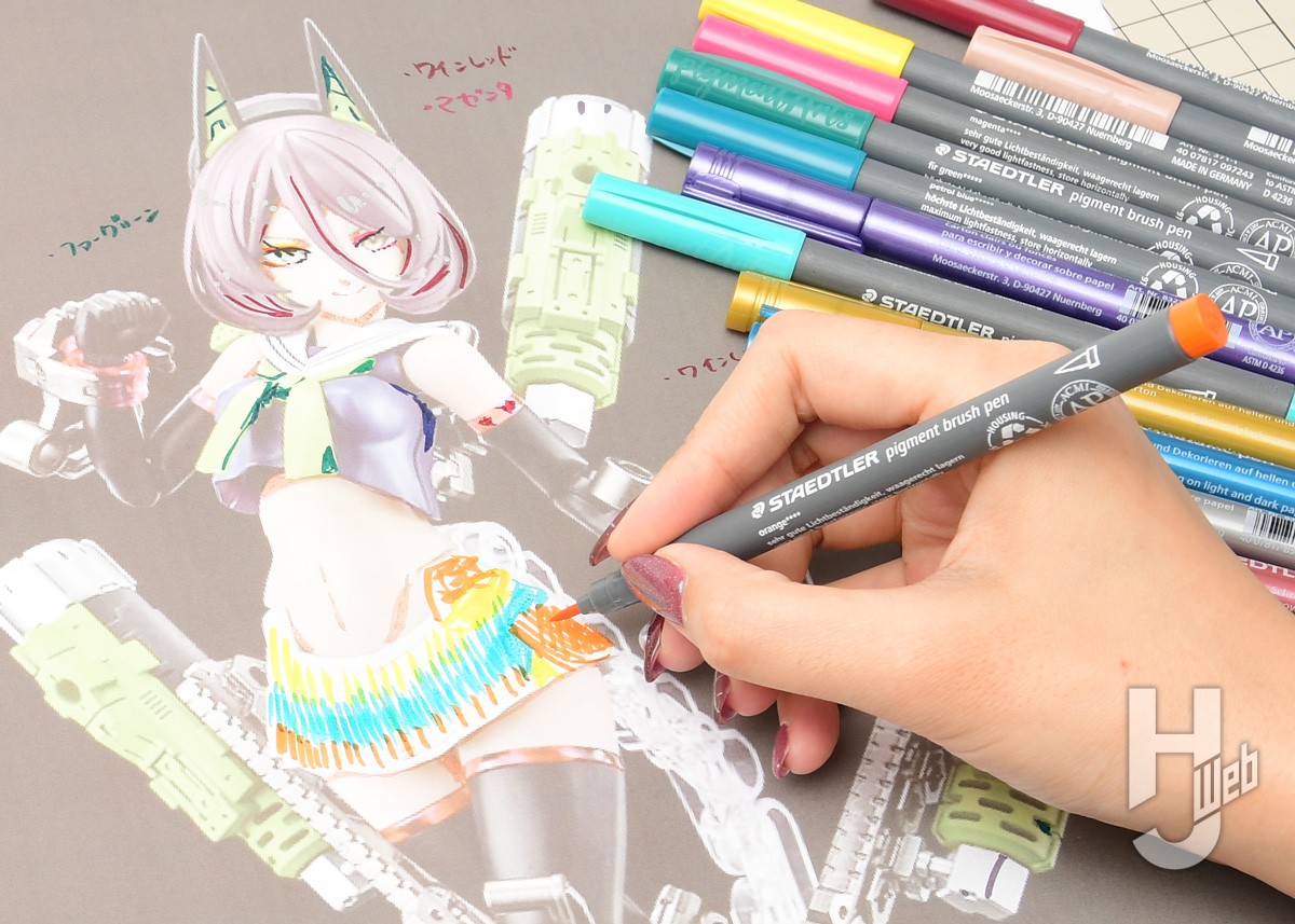塗装をしてみたいけど、道具を揃えたり後片付けが大変そう……という人にこそおすすめな「ペンツール塗装」。今回は色数が豊富なステッドラーの「ピグメントブラッシュペン」を使用してガールズプラモを塗装していきます。製作するのはホビージャパンスタッフのぴよ乃。果たして模型歴の浅いスタッフでも可愛くメイクアップすることができるのか……!?