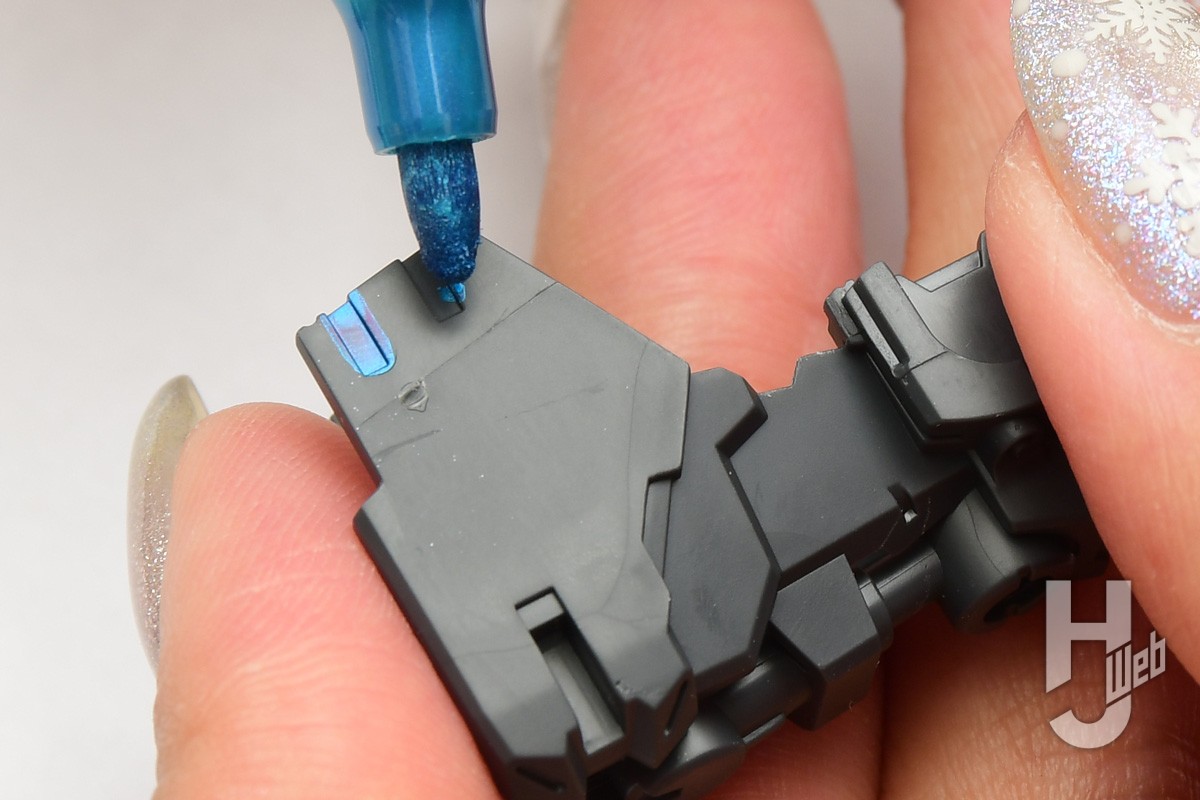 ▲ 装甲はディテール部分をメタリックマーカーのブルーで塗布。はみ出た部分は、綿棒で色を拭いました