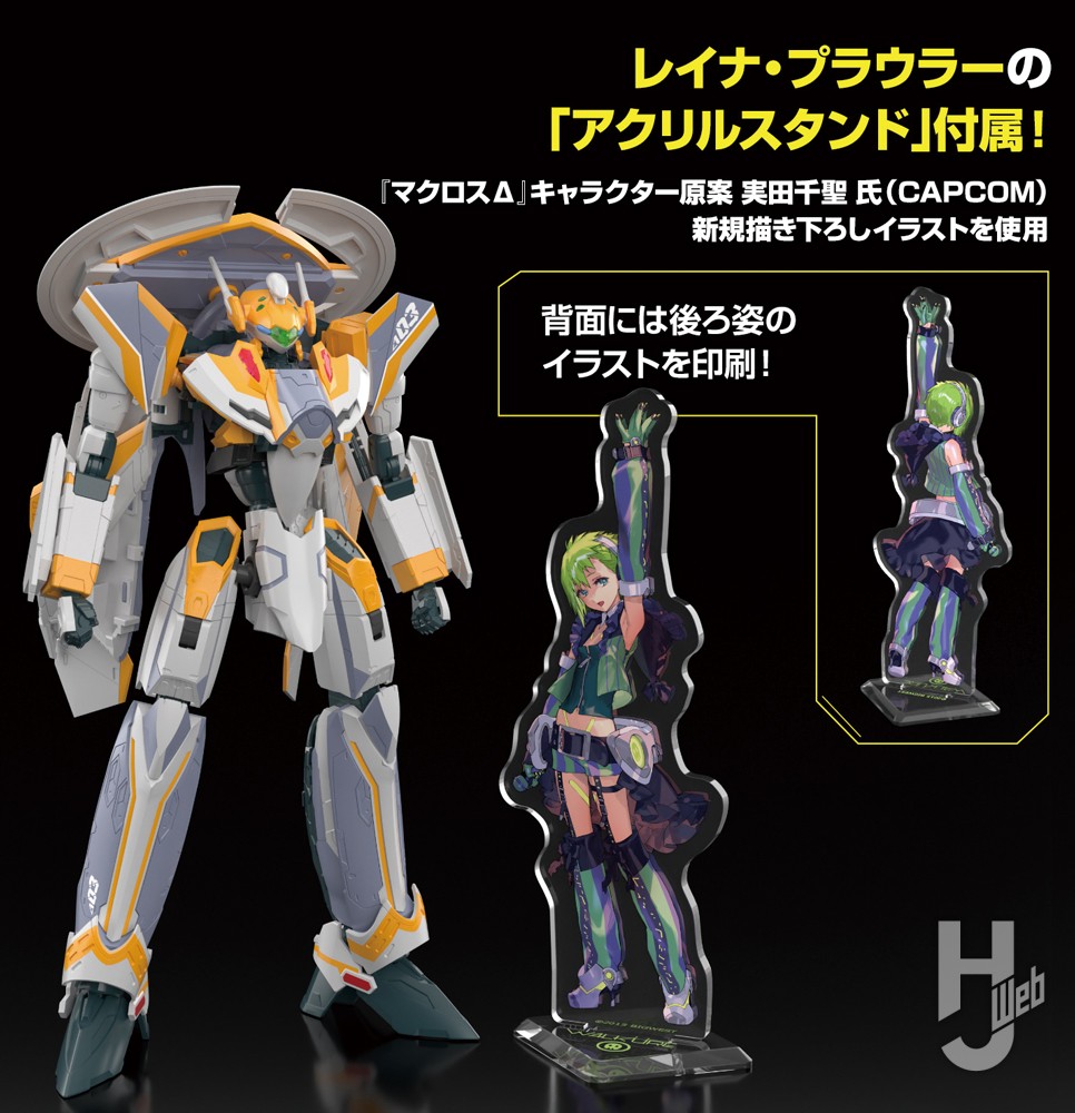 ▲同時発売となるデラックスセットには『マクロスΔ』キャラクター原案 実田千聖氏(CAPCOM)描き下ろしイラストをプリントしたレイナ・プラウラーのアクリルスタンド(両面印刷)と水転写式デカールが付属。ワルキューレ5人のステージ衣装フィギュアをレドーム上部に立たせることができるスタンドパーツはデラックスセットのみのオプションになる