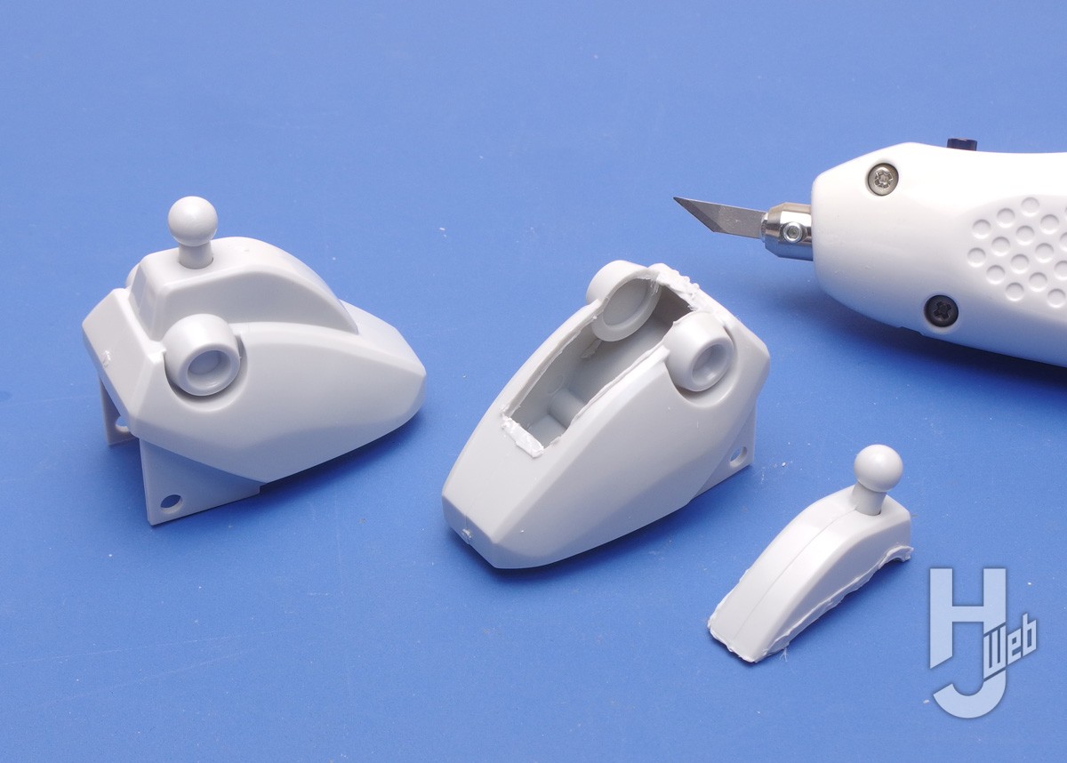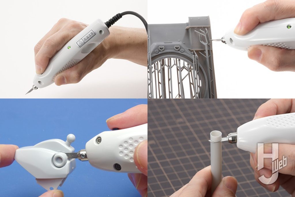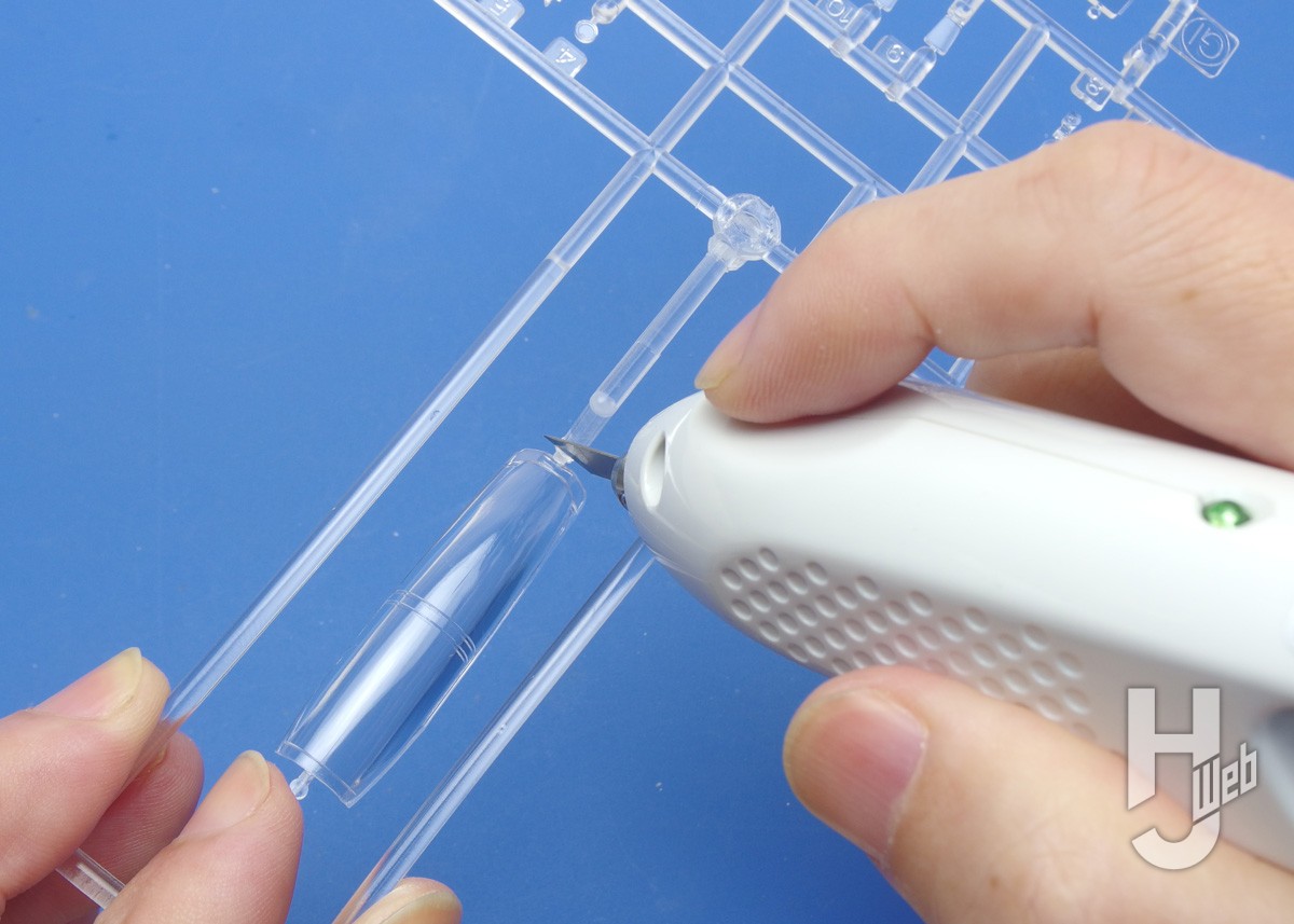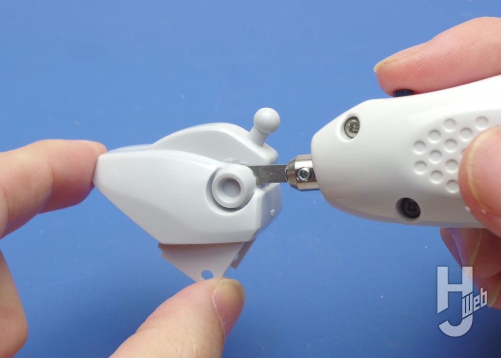 ▲プラモデルパーツの切り分け例。スイッチを押しながらパーツに刃先を差し込むように切り始められます。自由な向きで切り取り、切り分け、くり抜きができます。微振動の熱でプラが溶けるので、切り口のフチには歪みができます。それでも大まかな分段には便利ですし、切り口の歪みの程度、整形も見越して使うことになるでしょう。こうした歪みを抑えるための「Low」モードと薄刃は後で試します
