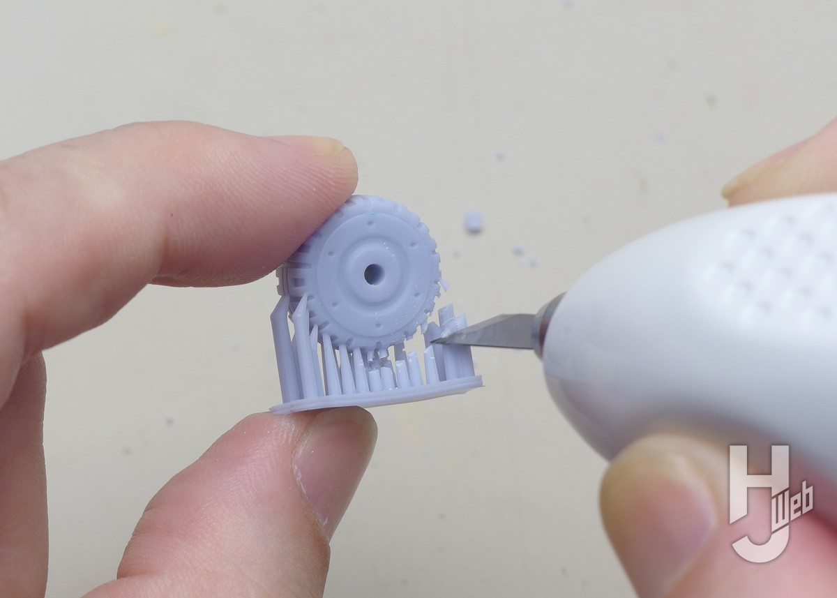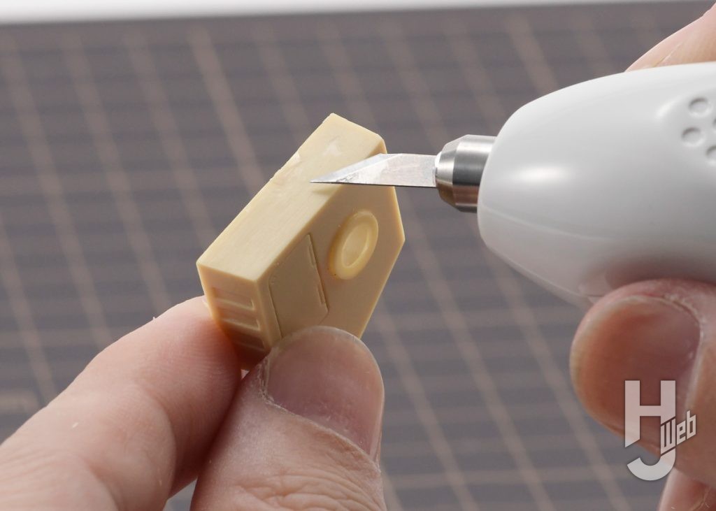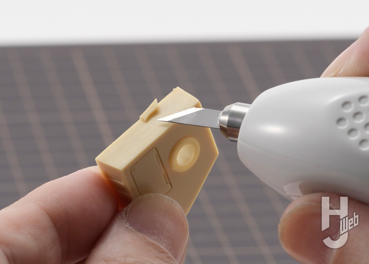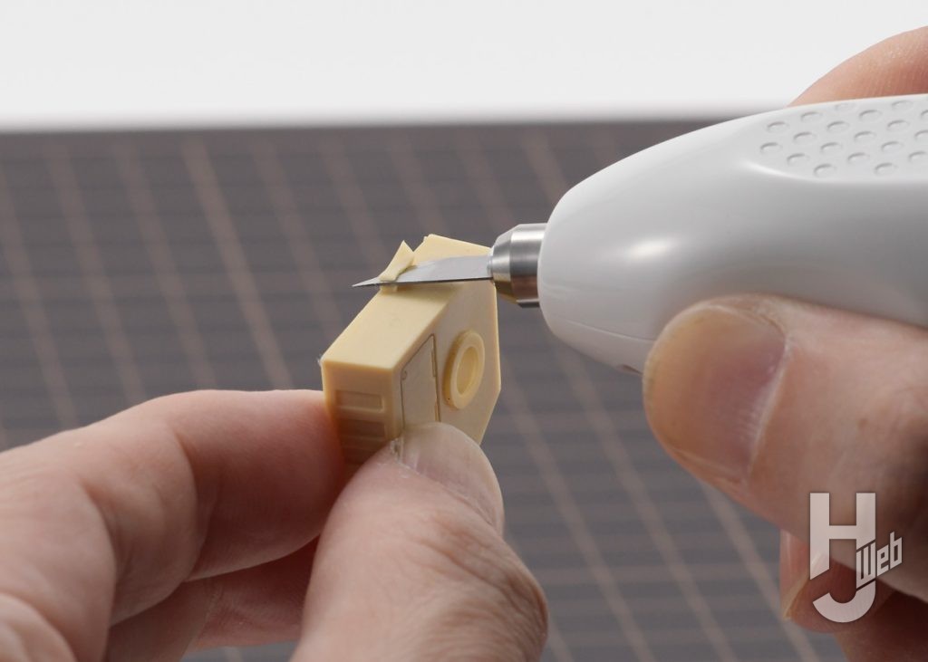 ▲製品名にもついているレジン(レジンキャスト、ポリウレタン樹脂)の湯口、ゲートの切り取りです。スイッチを押しつつ、削ぐように刃を入れます。すると刃が滑るように切り込めます。切り口も歪みなく滑らかです。上手く切り込めないときは無理に力を掛けず、刃をあてがうところからやり直しましょう