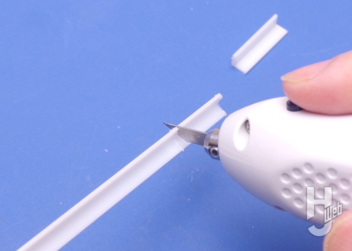 ▲厚みのあるプラ材やアングル材はニッパーでは切りづらいもの。超音波カッターなら周囲から切り込むことで手軽に分段できます。切り口は多少の整形が必要ではあります