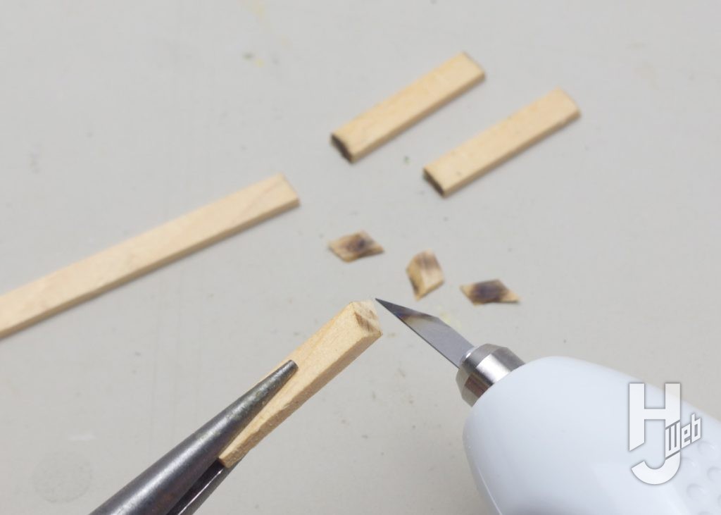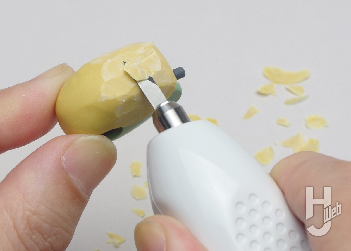 ▲エポキシパテやポリパテがカチカチに固まったあとの切削。これも超音波カッターがあって良かったと思う場面です。レジンの例と同様に薄く削ぐようにし、スパスパと表面を切り取っていけます。ヤスリで削るよりも楽で切削粉がでないのもメリットです