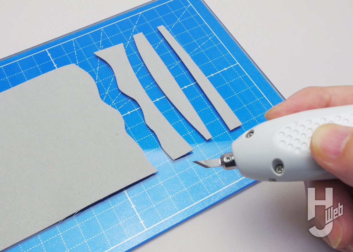 まずは超音波カッターの標準の刃と「Normal」モードで、基本的な使い方と切断の様子、特徴が活かせる場面などを見ていきましょう。なお製品の注意書きでは「厚さ3mmを超える樹脂や厚さ2mmを超える厚紙には使用しないこと」とされています。