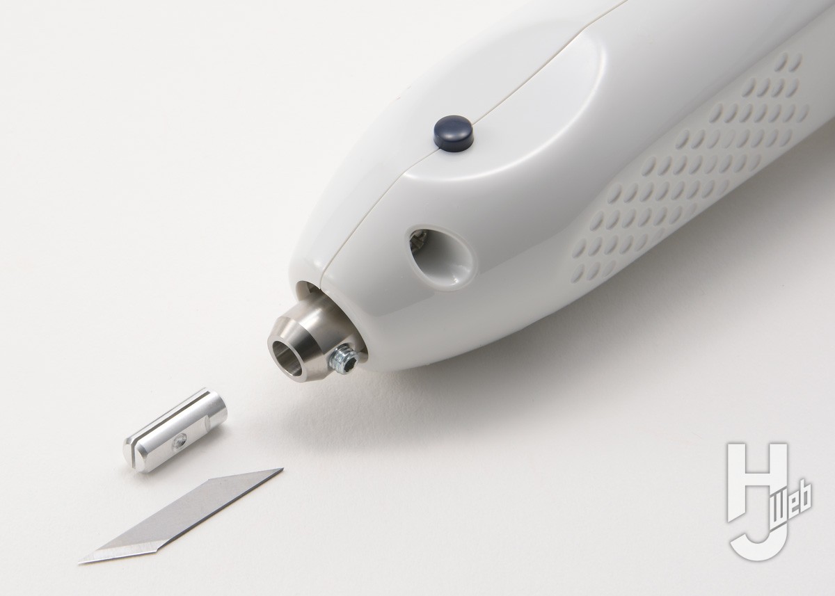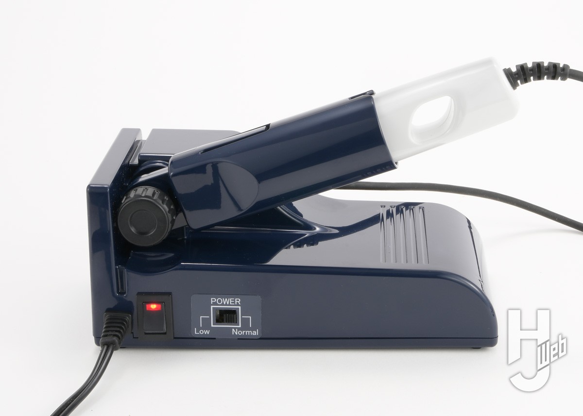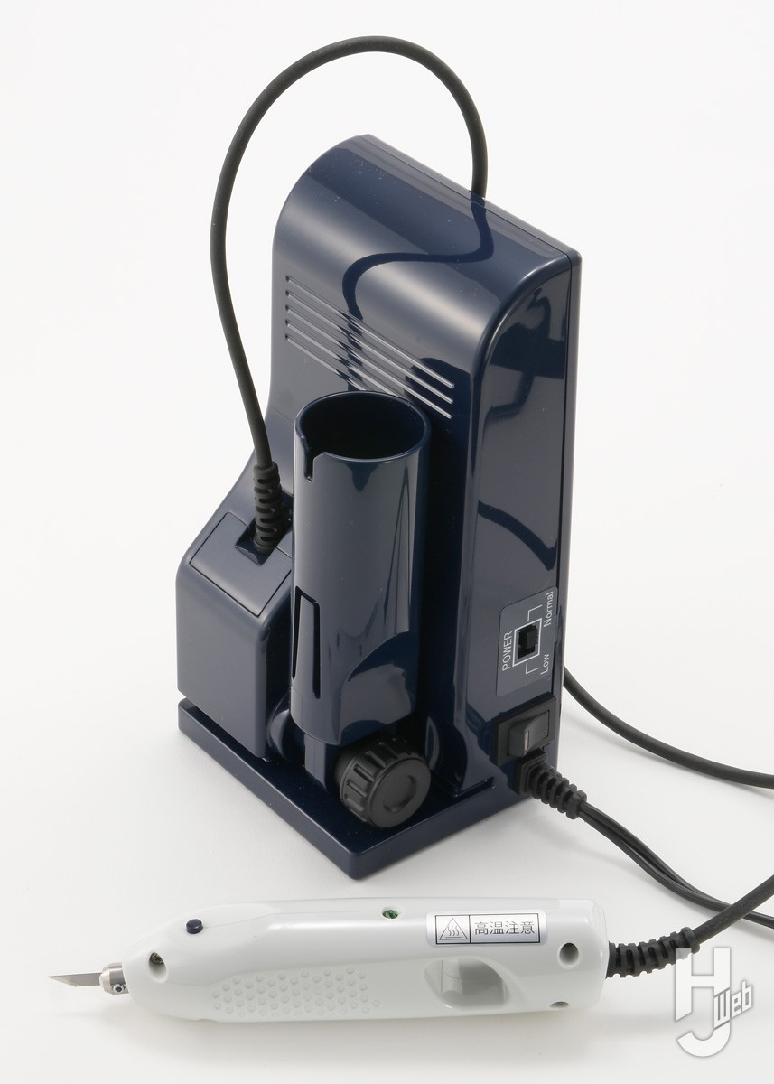 ▲刃先を高速振動させることで切断摩擦を減らし、力を掛けずに切断できるのが「超音波カッター」。「ZO-40レジンⅡ」は同社のホビー用ラインナップではミドルモデルといえるもの。「Ⅱ」では2段階のパワー切り替えが付いたのが変更点。「Normal」は従来通り、「Low」は別売の「薄刃」と組み合わせてプラ材の切断での“溶け”を抑えようというものになっています。本体は縦、横どちらにも置けるもので、ハンドピース部がホルダーに収まります