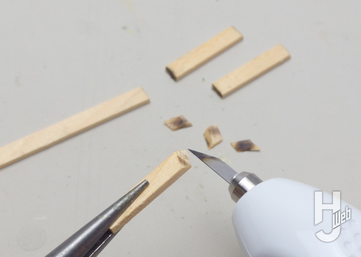 ▲細めの木材(2mm厚)を切ってみました。プラ材のようには切り込めませんが、少しずつ切り込みを入れ直すようにして切断できます。切り口がシャープで切りシロもほとんどなく切れています。熱で少し焦げているのも見え、やや負荷を掛けている切り方です