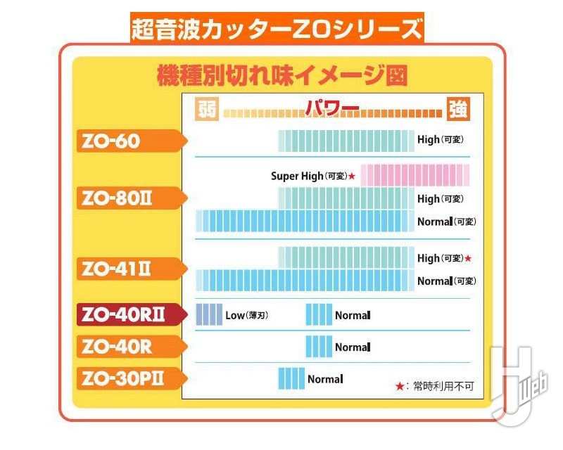 ▲機種別のパワー比較図(同社パンフより)。「ZO-40RⅡ」がこの機種。「Normal」のパワーは上位と比べて中間点、レジンをはじめ通常の切断はこのモードで行います。「Low」は薄刃向けで低めに設定されているのが分かります