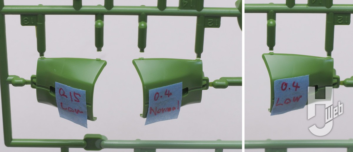 ▲「Low」と薄刃でゲートを切断したところ。刃の入りがよく瞬間的に切断でき、切り口の歪みも極わずかに抑えられています