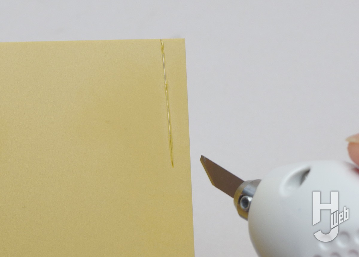 ▲続いてはプラ板(0.5mm厚)を切り込みした比較。ゲートの場合よりも切り込む時間が長く、刃と切断面の接触時間が長くなるので、「薄刃+Low」でもフチに溶けが見られます。「標準刃+Low」「標準刃+Normal」ではさらに歪みが多めとなっています