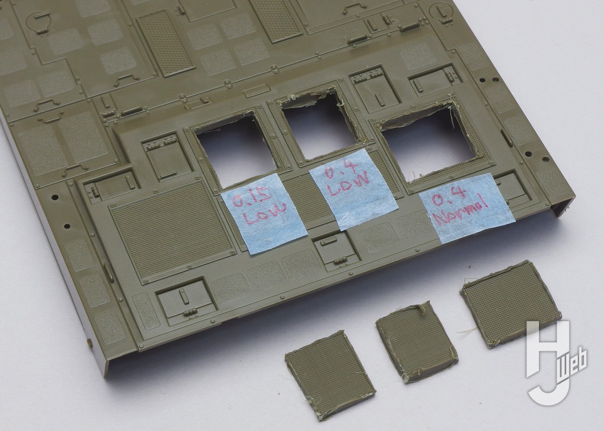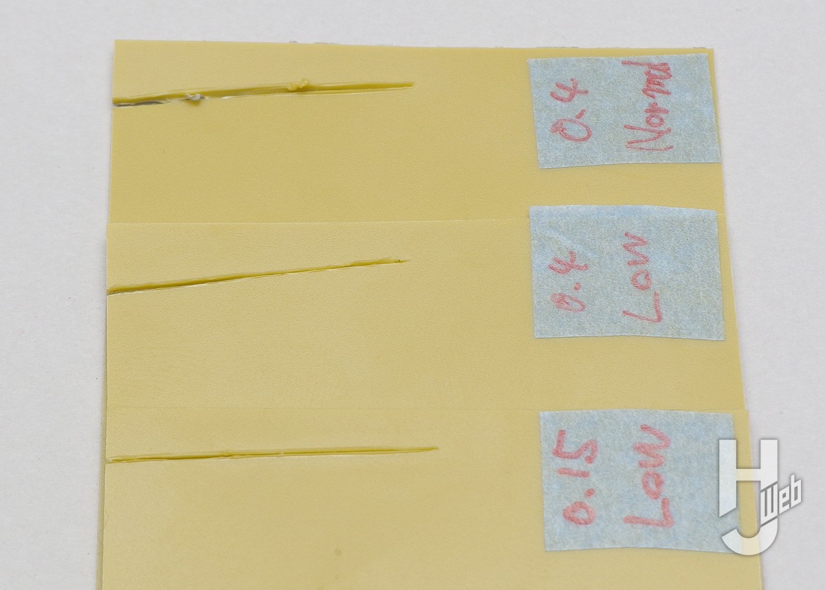 ▲パーツ面の切り抜きでの比較(厚みは1.7mm)。より刃面が接する時間や切り込みが多くなるので、それぞれの溶け具合も多めに出ています。板厚があるので刃の動きに樹脂が引っ張られる分、歪みが大きくでています。「薄刃+Low」では歪みが少なく、切り口の整形が少なく済むのが確認できます