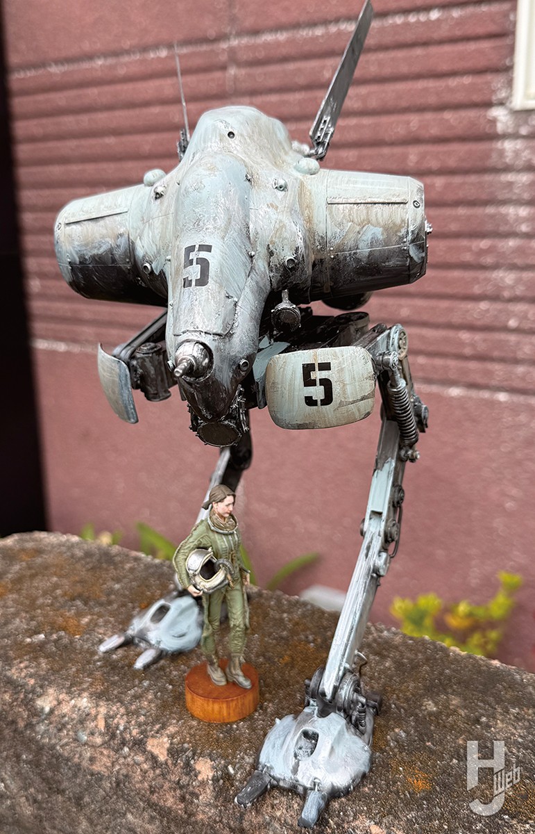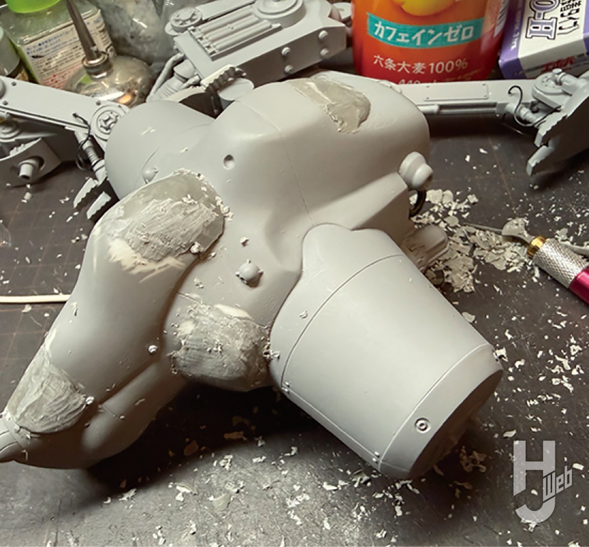 今から40年前、描き起こしたメカのデザイン画をアゲちゃんこと揚田幸夫氏に渡して立体造形を頼んでいたことは当時からの読者ならよく知っていることだと思います。当時からの読者は今では50代から60代の立派すぎるおっさんになっていると思います。これらの「絵に描いた餅メカ」ならぬ「絵に描いたアゲちゃんメカ」が気になってる人が少なくないというのがワンフェス参加する勇者たちが選んでガレージキット化したメカからわかってきました。今回の「フクス」もそんな揚田作品をオマージュしたガレージキットとしてチャーリーさんが2020年にリリースしたもの。これまた人様に立体化してもらった造形なんです。それを「今ならここはこうする、あそこはああする」とか言いながら最新のツールとマテリアルを使って好きなだけカスタマイズしたのが今回の作例なんですね。(横山宏)