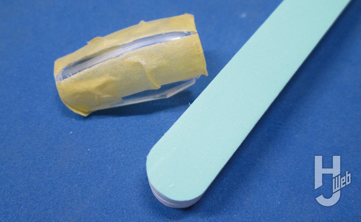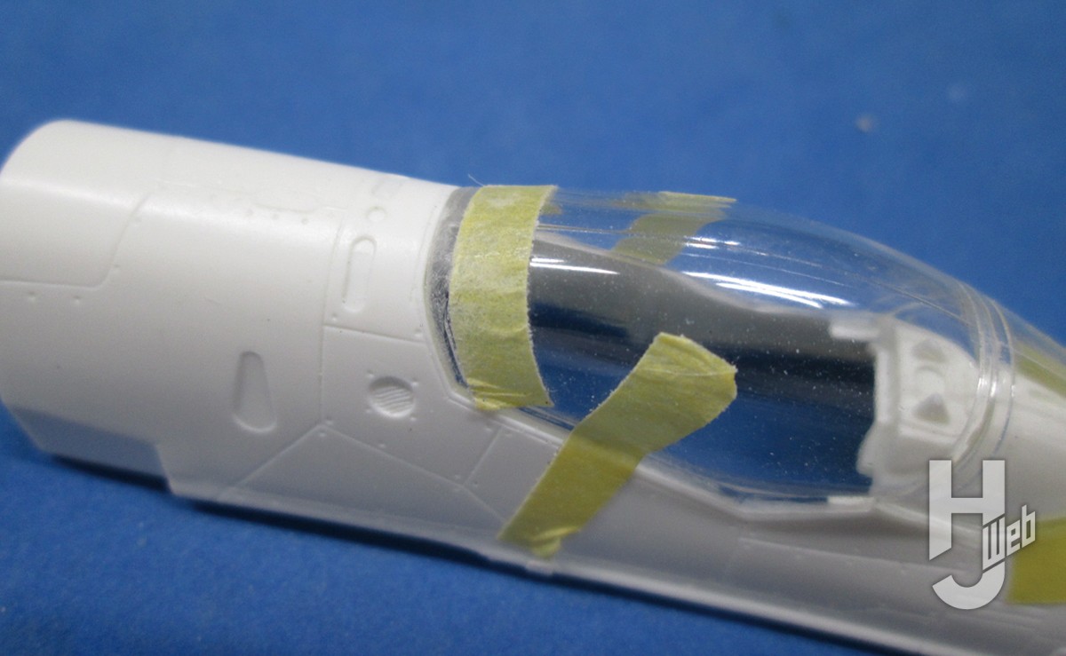 まず先にキャノピーの合わせを見ておきます。ゲートに注意しながら切り離し、胴体を使って合わせをチェックします。後ろ側に少し隙間ができたので、修正しました。キャノピーは閉じた状態にするので、バランスを見ながら前後を接着します。