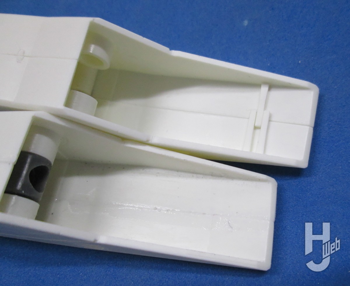 機首下と頭部収納部あたりのパーツは左右で厚みが違っており、つなぎ目がズレていたので、削り込んで形状を整えます。主翼は接続軸に押し出しピン跡があるので、フラットに整形してスムーズに差し込めるようにしておきます。