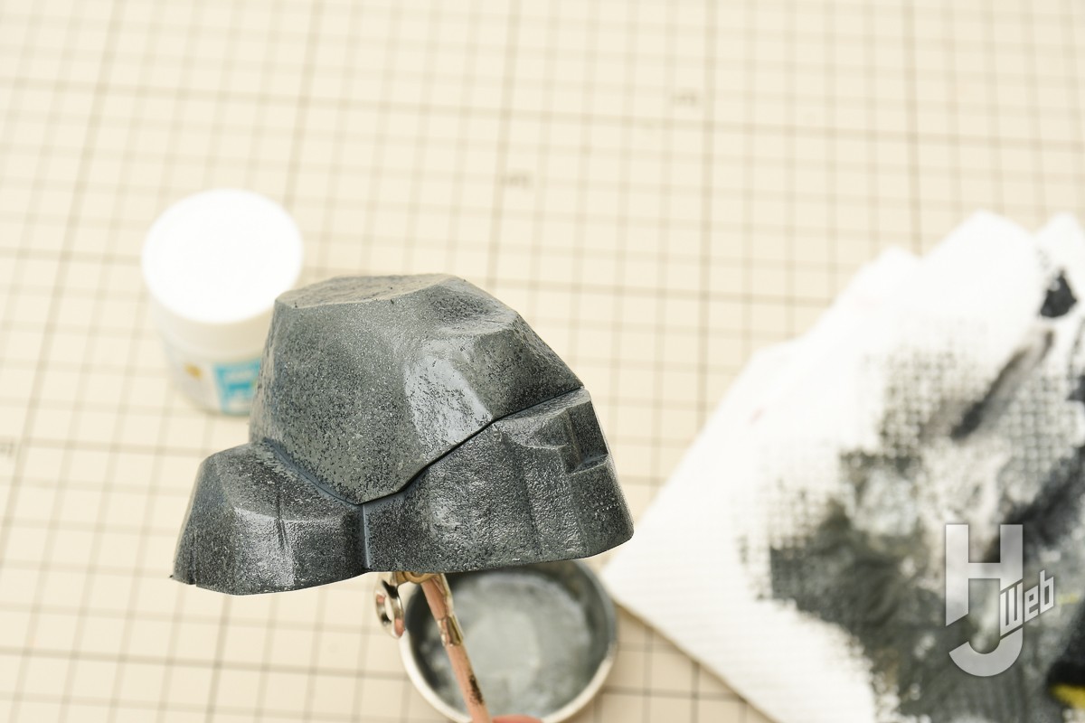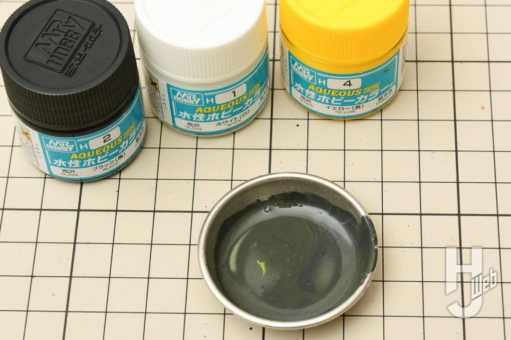 ▲ホワイトを加えてグレーを準備。さらにより自然にある色味を狙って、イエローも付け足します。2色目のスポンジ塗装ではすべてを塗りつぶさずに少しランダムに塗布していきます