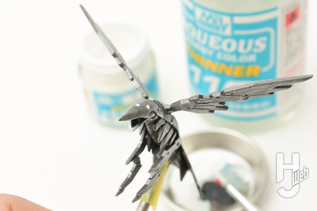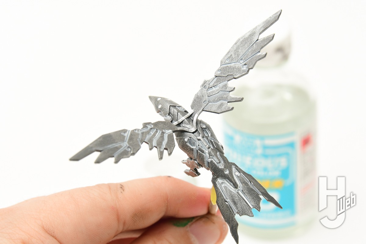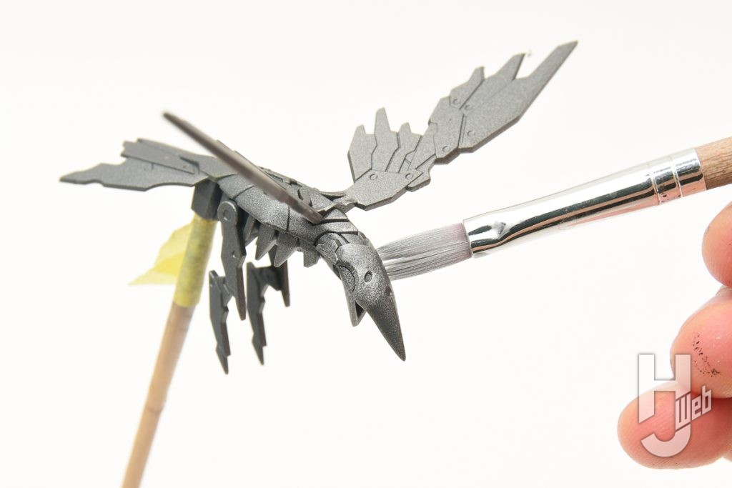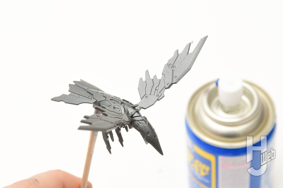 ▲ 「鳥」の塗装ではメタリック色の「Mr.カラースプレー 焼鉄色」(880円)を使用。本体も大きくもなく、グレーの成型色でもあるので軽く吹き付ければしっかりと色が乗ります