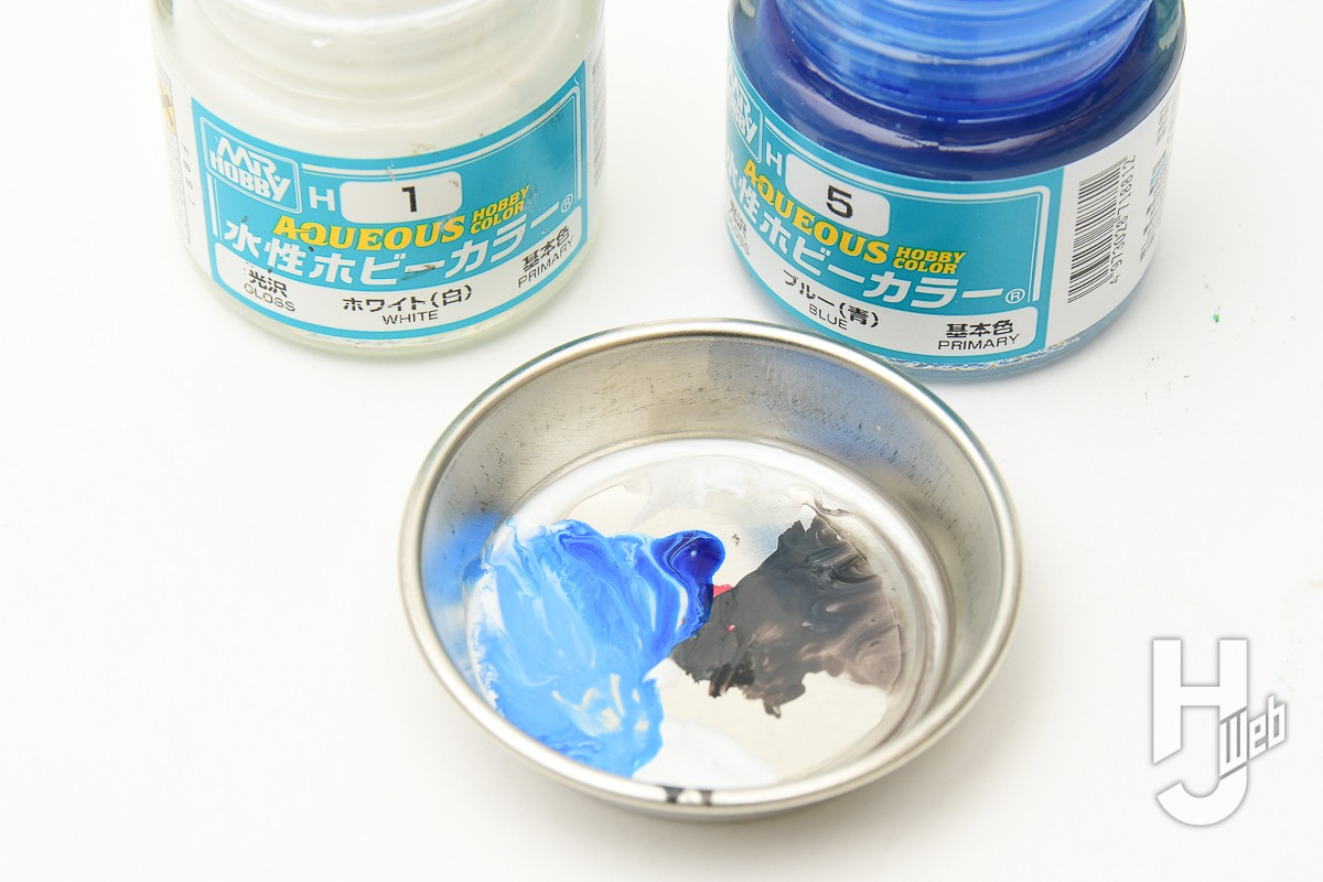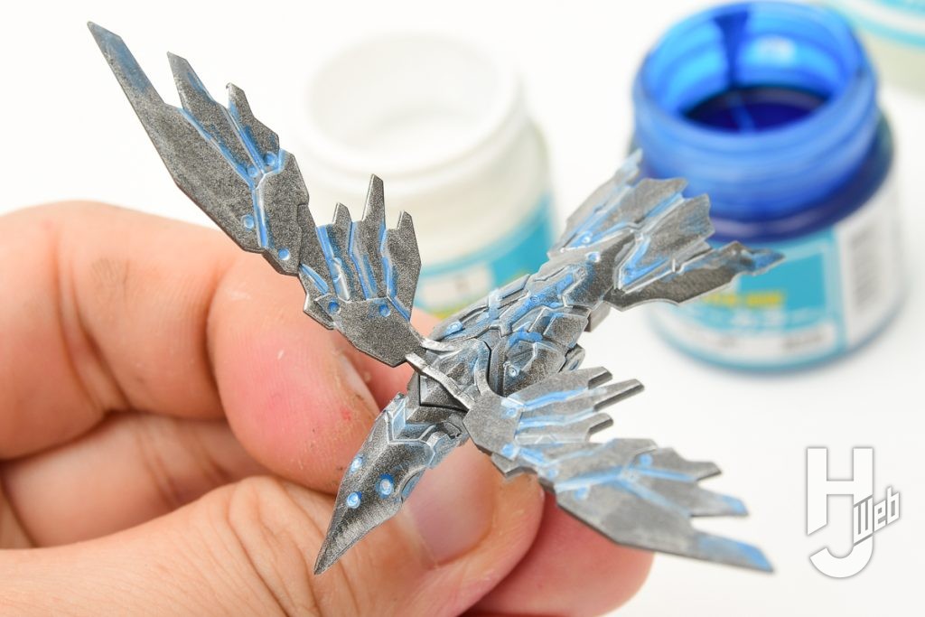 ▲ そのあとはホワイト+ブルーで水色を作り、ホワイトを流し込んだ溝の横をなぞるように薄く塗布します(ホワイトを塗りつぶさず少し残るようににします)