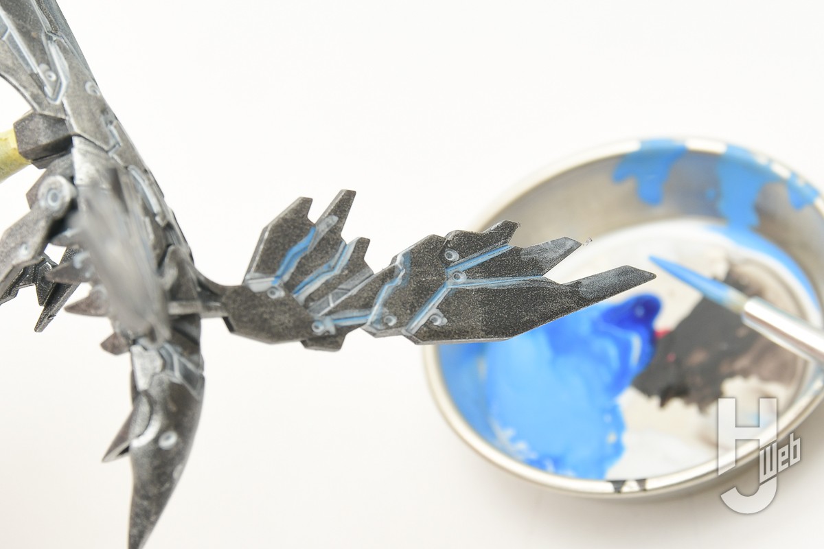 ▲ ここからさらにエフェクトを加えていきたいと思います。薄く希釈したホワイトをスミ入れの要領で各所の溝に流し込んでいきます