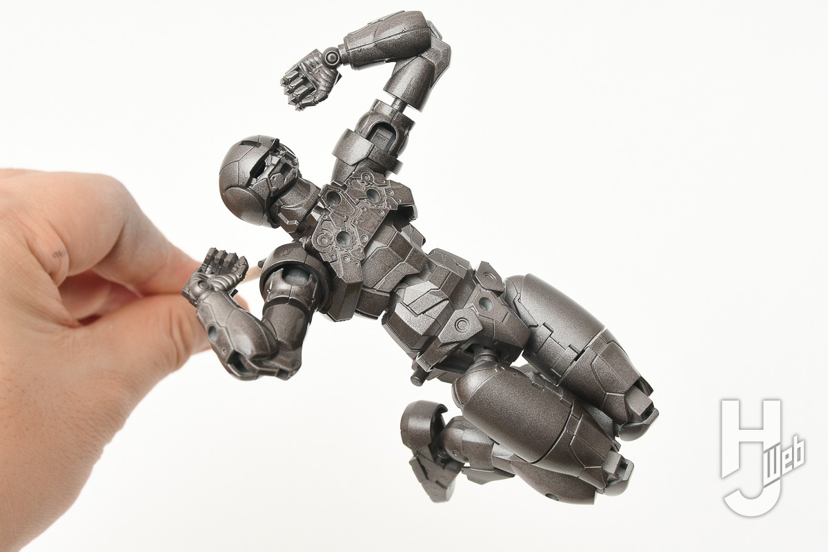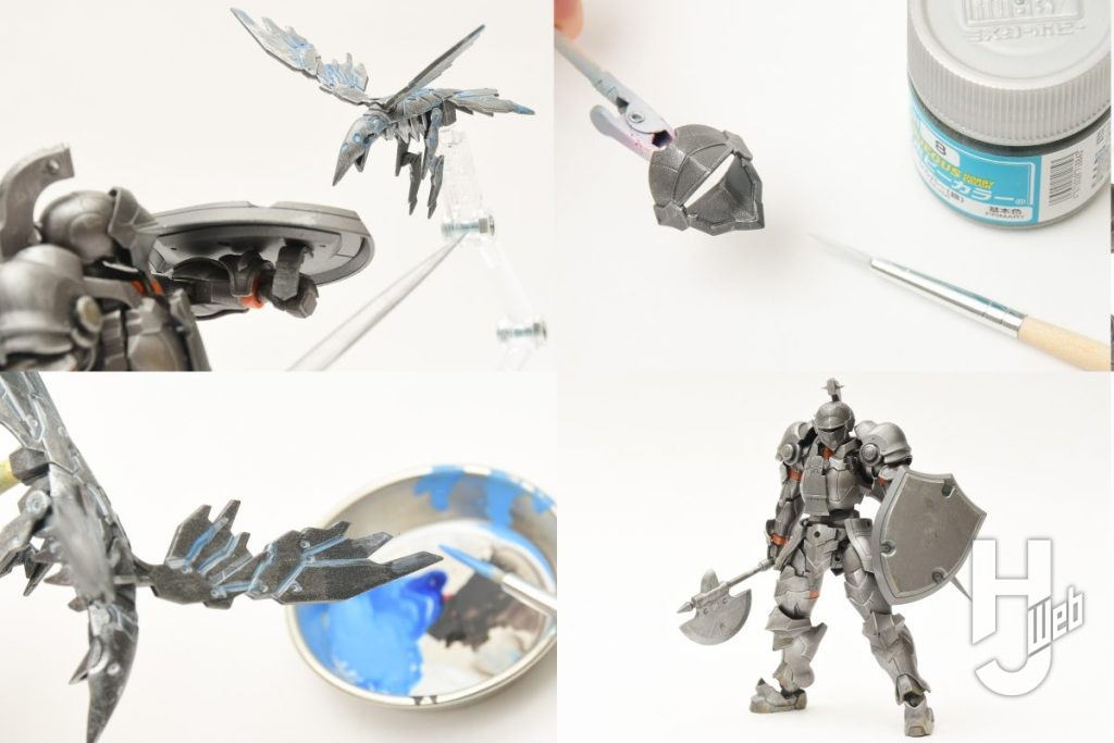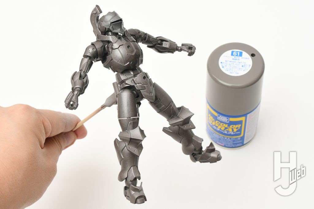 ▲ 今回はできるだけパーツを塊の状態で塗る簡単製作です。オレンジ色のジョイントパーツはそのままの色がよかったので、そのパーツを取り除いて組みあがった状態にしたら「Mr.カラースプレー 焼鉄色」で塗装。乾燥したら鎧を取り外して素体にし、可動部を動かして塗り切れていない部分もフォローします。これで基本塗装はOK!