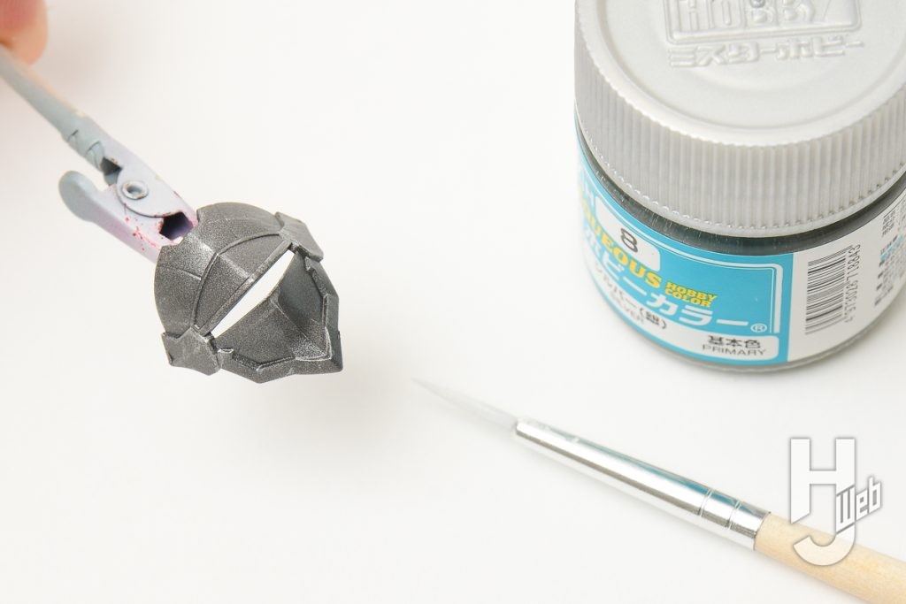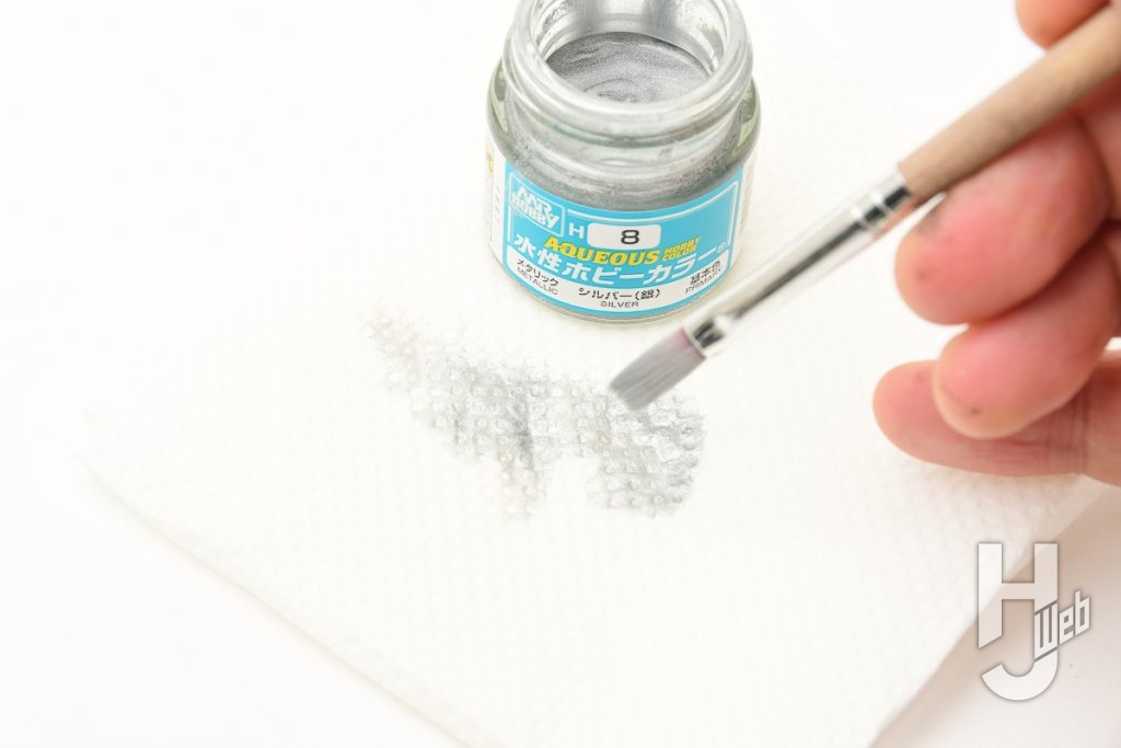▲ 乾燥させたらシルバーを使用してドライブラシしていきます。筆につけた塗料を少しふき取り、筆で全体をひっかくようにシルバーをこすりつけていきます