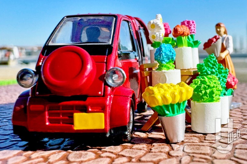 「花屋」をテーマにした1/64統一スケールのミニカー・フィギュア・小物のセット。