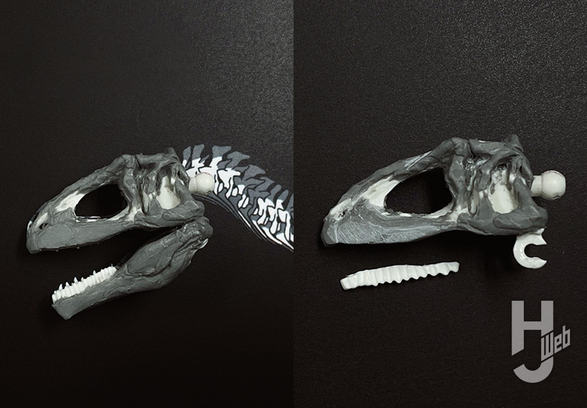 ▲まずは頭骨から。北九州市立いのちのたび博物館などで展示されているギガノトサウルスの復元頭骨は、本来よりもかなり長く復元されている。キットの頭骨はちょうどよい長さだが、かなり面長だ。邪魔になる上アゴ骨歯をいったん切り離したのち、全体を切り張りしていこう